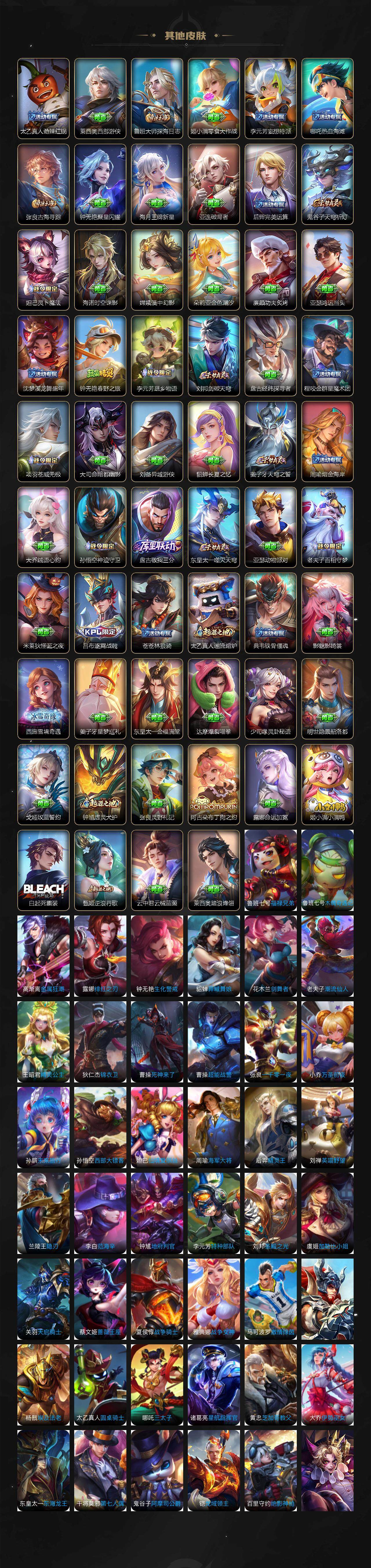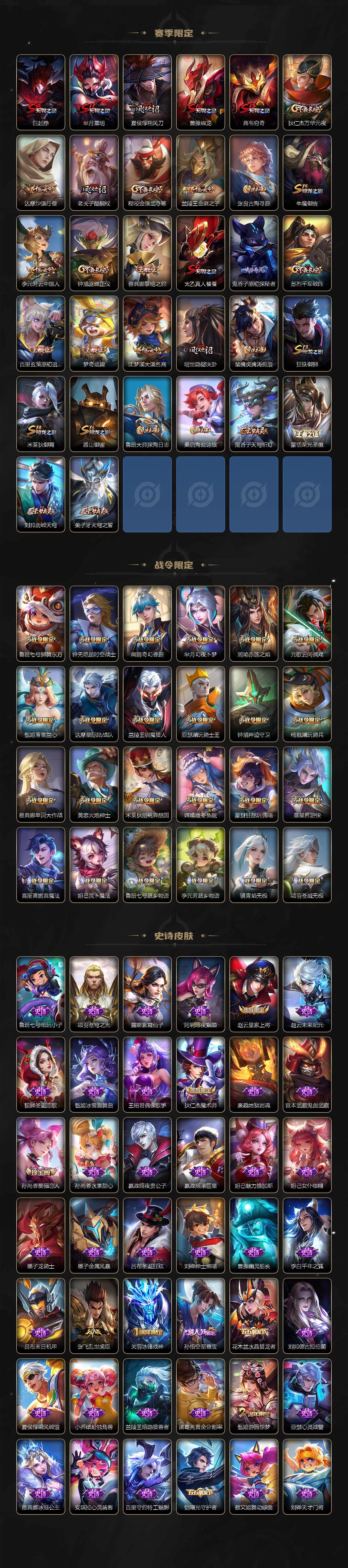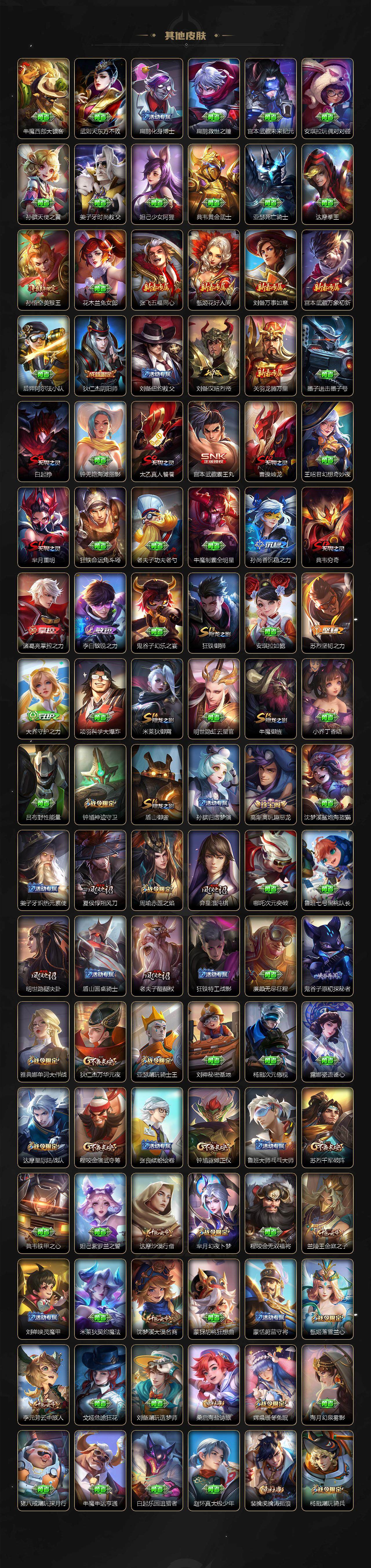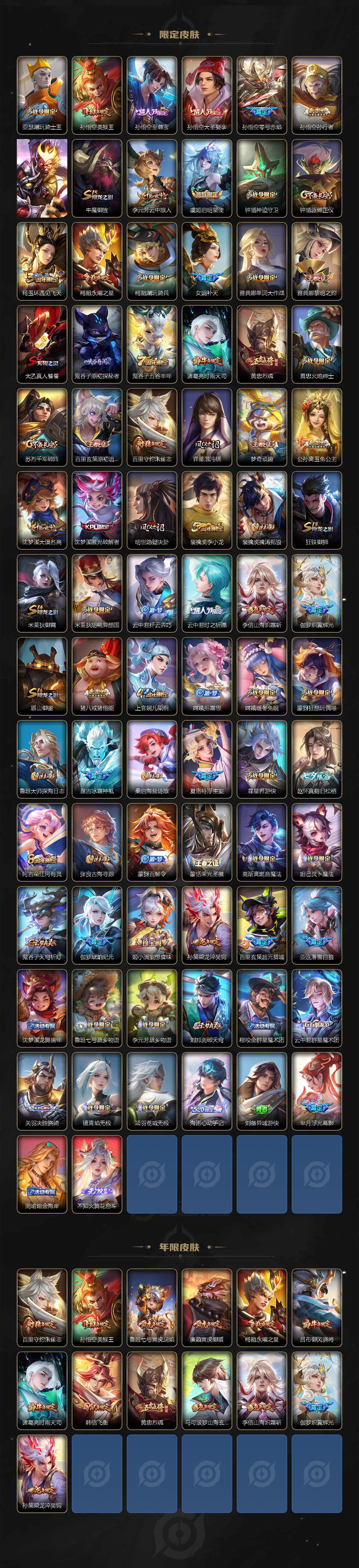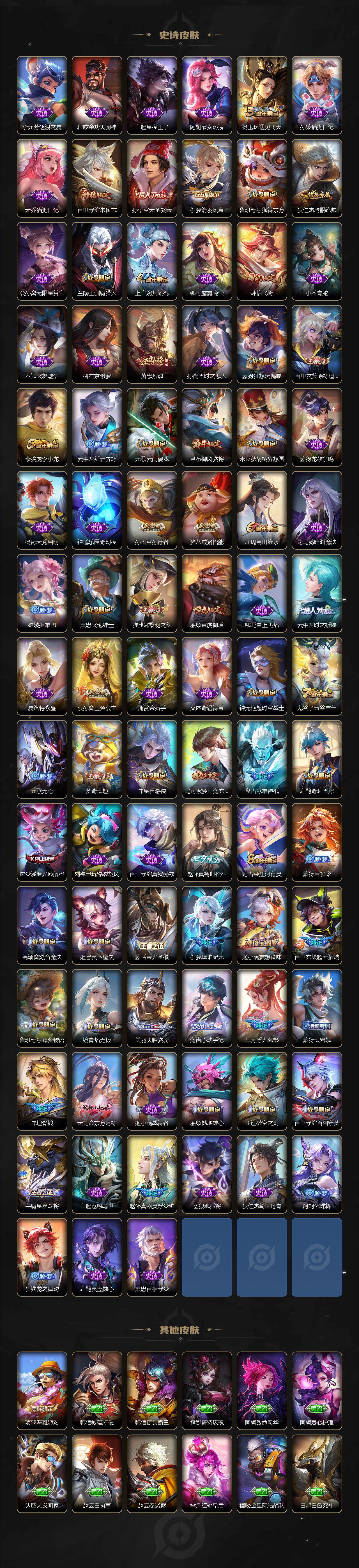 【限定皮肤】:白起狰,暃埋骨钱,蒙犽顽岩魄,大乔绒语心约,姜子牙天穹之誓,狄仁杰阴阳师,廉颇寅虎御盾,赵云皇家上将,孙尚香蔷薇恋人,孙尚香异界灵契,鲁班七号狮舞东方,鲁班七号寅虎瑞焰,鲁班七号时之奇旅,庄周高山流水,高渐离玩趣恶龙,钟无艳超时空战士,扁鹊奇幻香踪,芈月重明,芈月幻夜卜梦,吕布御风骁将,吕布遇见神鼓,周瑜赤莲之焰,元歌云间偶戏,元歌无心,夏侯惇朔风刀,甄姬游园惊梦,甄姬落雪兰心,曹操烛龙,典韦穷奇,马可波罗山海玄木吟,狄仁杰魔术师,狄仁杰万华元夜,达摩星际陆战队,达摩沙漠行僧,项羽海滩派对,老夫子醍醐杖,关羽冰锋战神,程咬金演武夺筹,韩信飞衡,兰陵王驯魔猎人,兰陵王金庭之子,不知火舞绯月行,亚瑟潮玩骑士王,孙悟空美猴王,孙悟空至尊宝,孙悟空大圣娶亲,孙悟空零号赤焰,孙悟空孙行者,孙悟空齐天大圣,牛魔御旌,李元芳云中旅人,虞姬启明星使,钟馗神迹守卫,钟馗驱傩正仪,杨玉环遇见飞天,杨戬永曜之星,杨戬潮玩骑兵,女娲补天,雅典娜单词大作战,雅典娜黎明之约,太乙真人饕餮,鬼谷子原初探秘者,鬼谷子五谷丰年,诸葛亮时雨天司,黄忠烈魂,黄忠火炮绅士,苏烈千军破阵,百里玄策原初追逐者,百里守约朱雀志,弈星混沌棋,梦奇顽趣,公孙离玉兔公主,沈梦溪大漠名商,沈