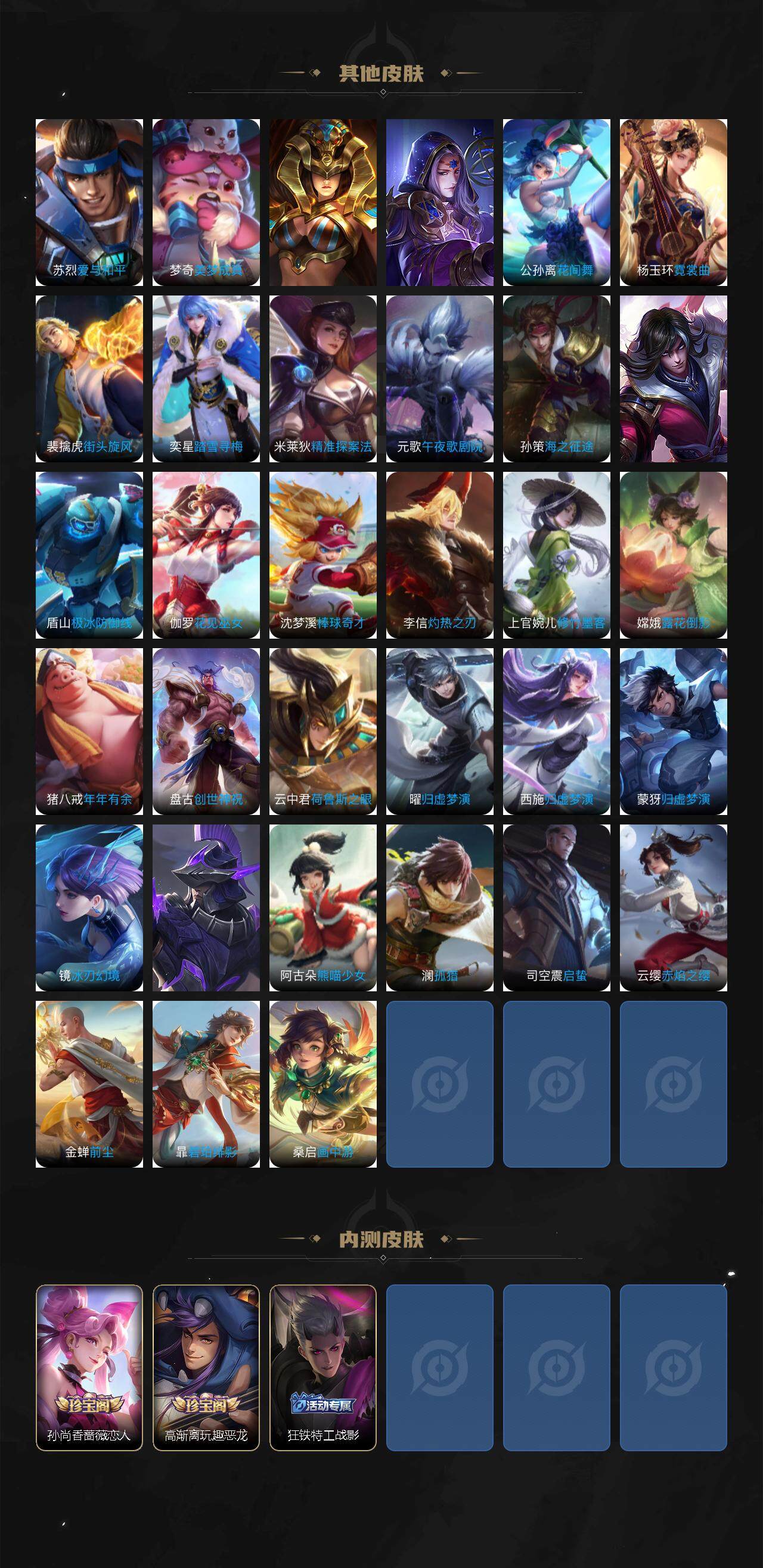 关羽冰锋战神,裴擒虎李小龙,上官婉儿梁祝,吕布御风骁将,诸葛亮时雨天司,黄忠烈魂,韩信飞衡,百里守约朱雀志,孙悟空大圣娶亲,孙悟空至尊宝,孙悟空美猴王,猪八戒猪悟能,廉颇寅虎·御盾,孙尚香异界灵契,孙悟空孙行者,鲁班七号寅虎·瑞焰,云中君时之祈愿,女娲补天,公孙离玉兔公主,不知火舞绯月行,马可波罗山海·玄木吟,盘古冰霜神祇,桑启鸣野蒿,澜愿照·九州拓,蔡文姬愿照·福禄聚,虞姬愿照·岁时盈,司空震愿照·山河定,妲己愿照·众生和,女娲愿照·千秋盛