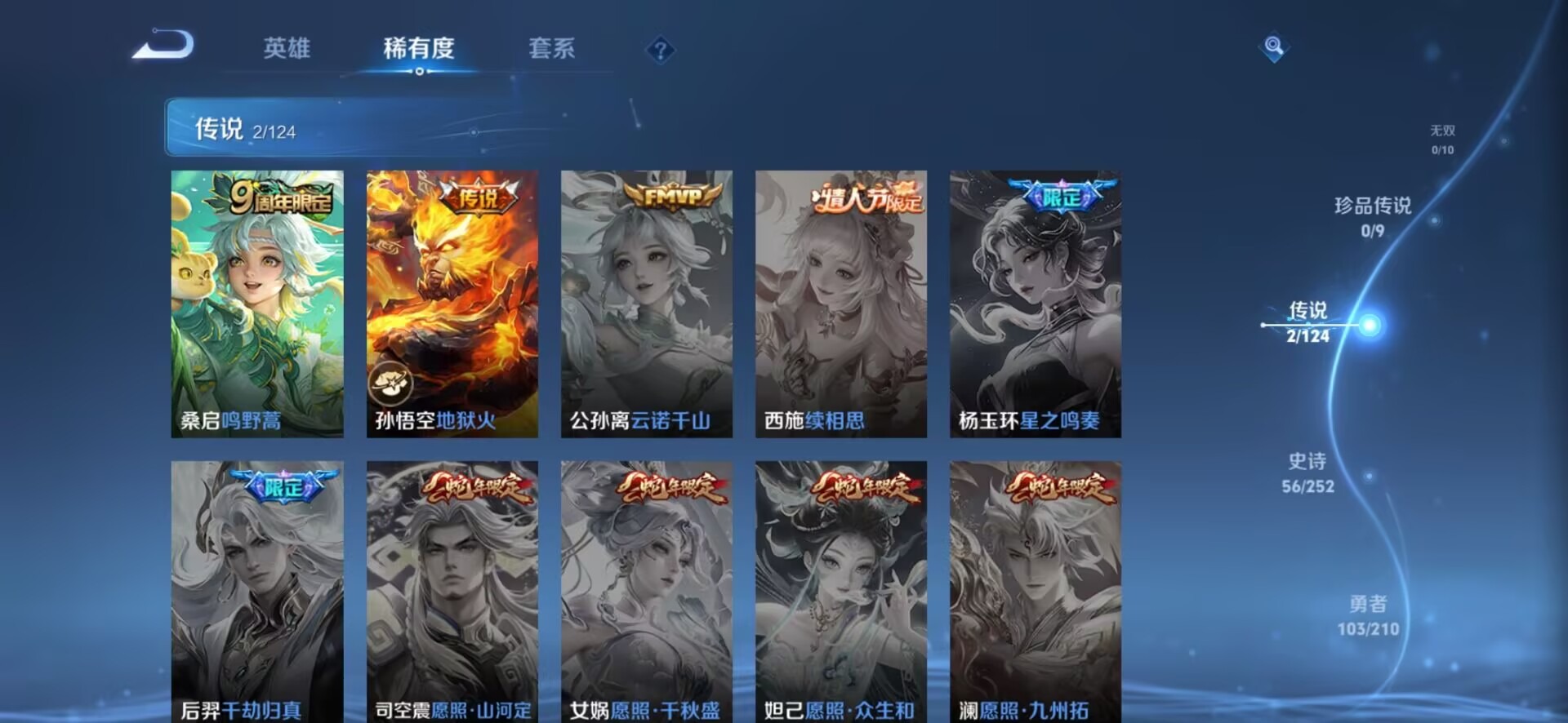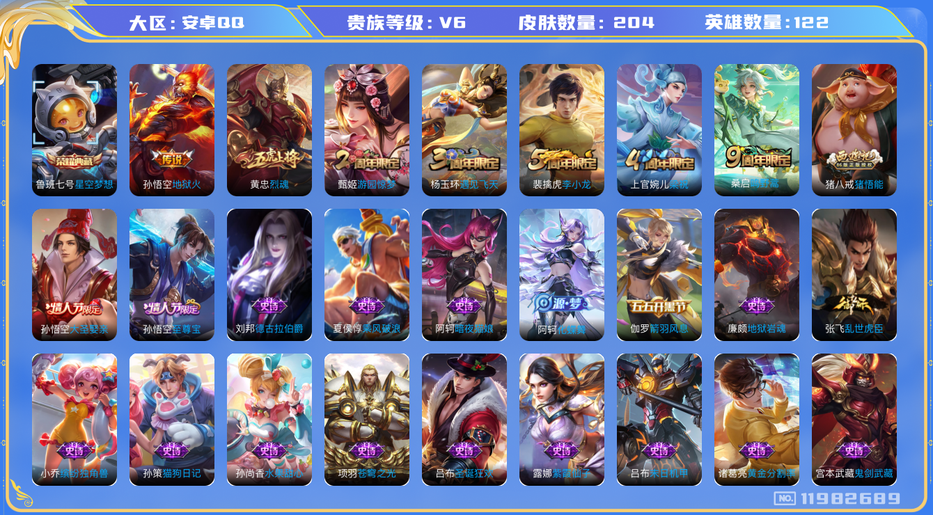 - [12002225]V7 1典藏 1珍品传说 9传说 125英雄 203皮肤 可修改实名 优质装备:鸣剑·曳影,怪盗基德,炽阳神光,山海·炽霜斩(李信年限) 传说皮:祥瑞亨通,幻光神枪 珍宝阁皮:万物之道,蔷薇恋人 限定皮:愿照·九州拓(澜年限),愿照·岁时盈(虞姬年限),愿照·山河定(司空震年限),鸣野蒿,遇见飞天,诗剑行,五谷丰年,李小龙,山海·玄木吟(马可年限) 史诗皮:星界战将,龙之律动,茶境仙,怒海争锋,破空之剑,蒙犽顽岩魄,百相守梦-百里守约,紫霞仙子,苍穹之光,电玩小子(小书包),黄金分割率,特工魅影,江河有灵,真我赫兹(镜),魅语,百解令(蒙犽),蒙恬荣光圣徽,偶像歌手,白蛇,电玩·爆裂旋风,末日机甲-吕布,乱世虎臣,节奏热浪,摇滚巨星,水果甜心,星夜王子,心灵骇客,功夫厨神,暗隐猎兽者,幽灵船长,鬼剑武藏,天秀·启明,缤纷独角兽,乘风破浪,逐浪之夏,月团寄思,水晶猎龙者,曙光守护者,箭羽风息,唤灵魅影,金属风暴,原初追逐者,圣诞狂欢,圣诞恋歌,鹰眼统帅,黎明之约,赏金猎手,无心,未来纪元-赵云