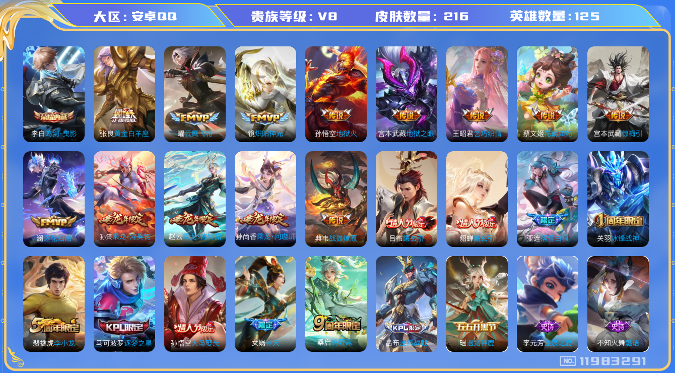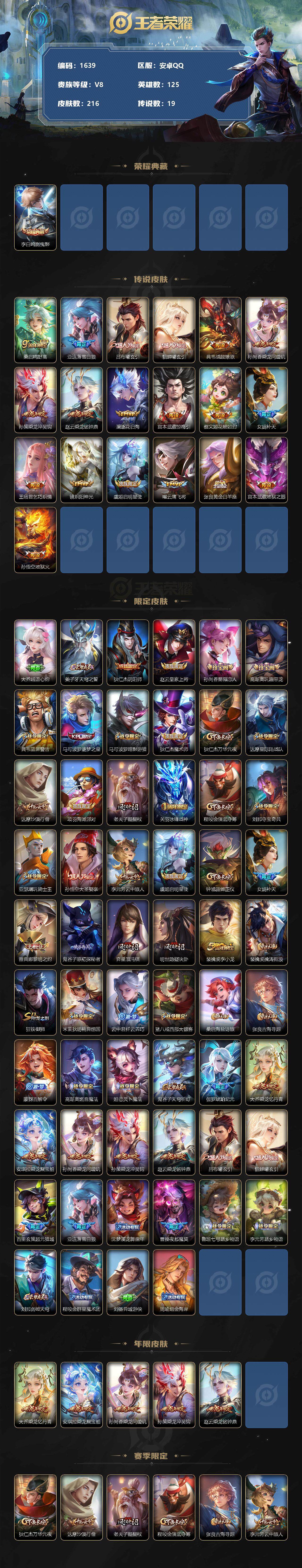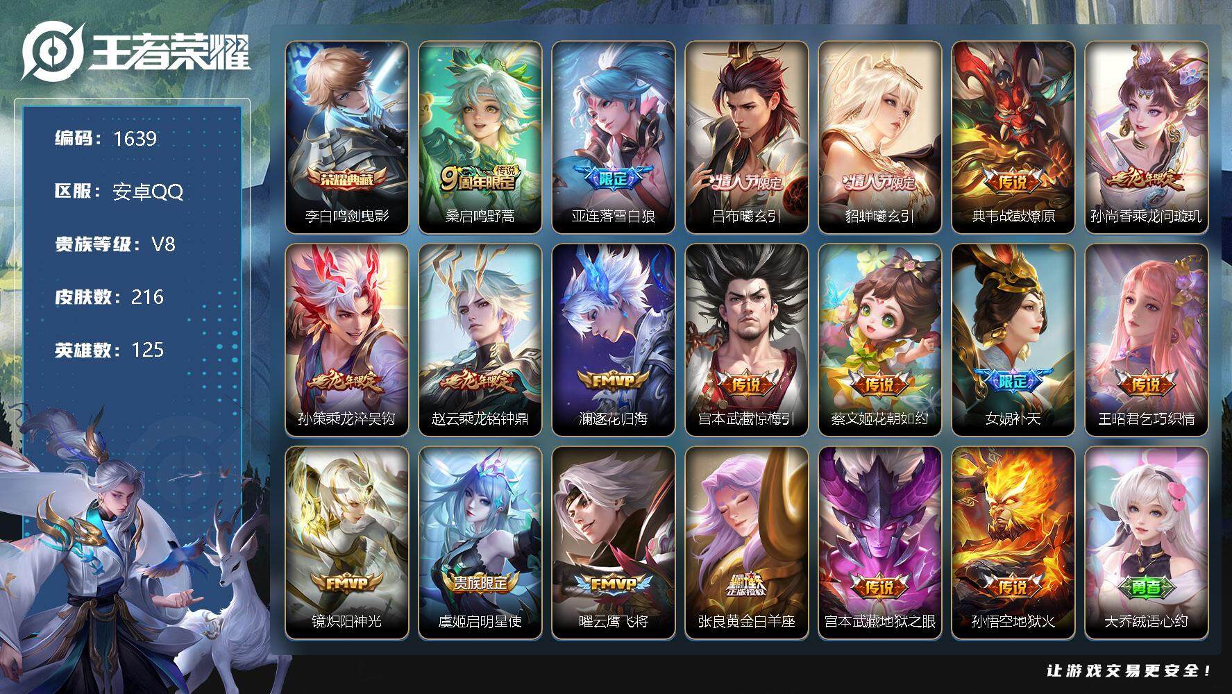 [11983291]【商品标题】:安卓Q-V8-最强王者段位-125英雄-216皮肤-1典藏-0珍品无双-0无双-0珍品传说-19传说-54史诗