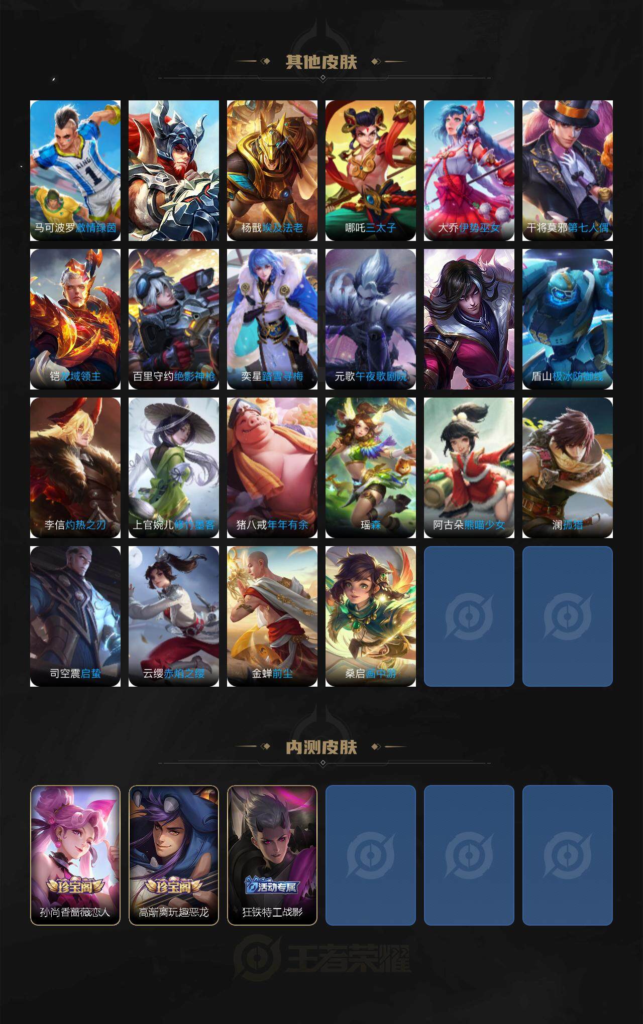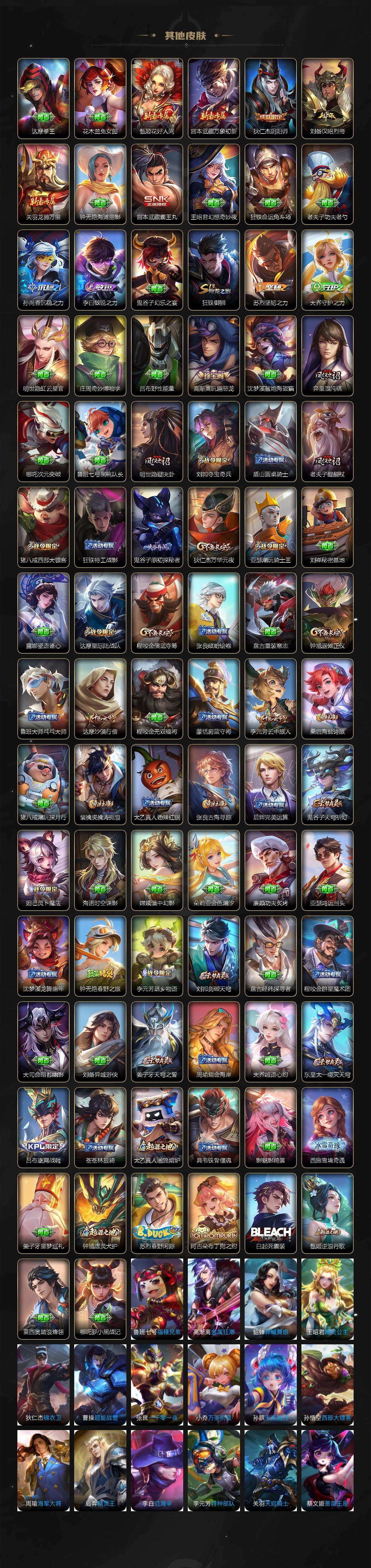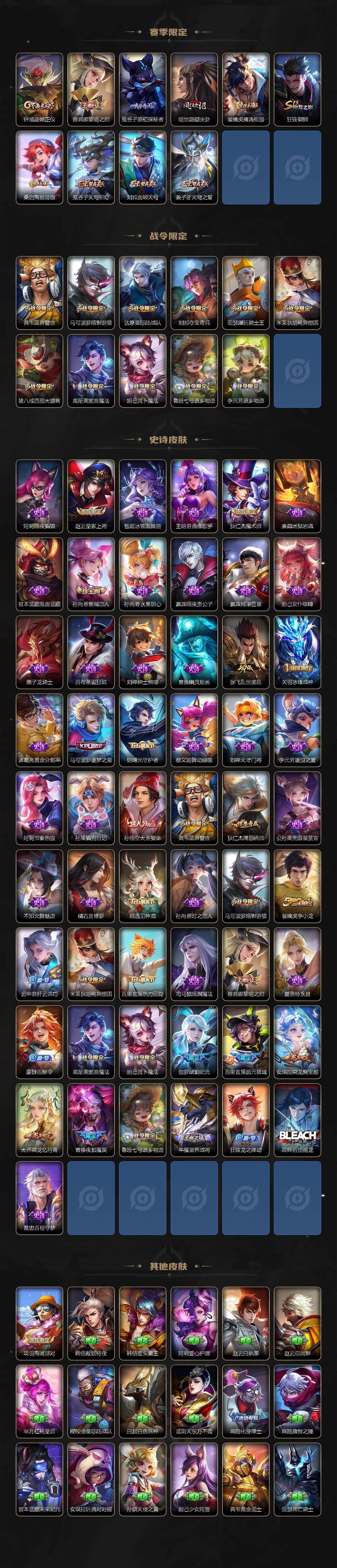 【限定皮肤】:大乔绒语心约,姜子牙天穹之誓,狄仁杰阴阳师,赵云皇家上将,孙尚香蔷薇恋人,高渐离玩趣恶龙,典韦蓝屏警告,马可波罗逐梦之星,马可波罗暗影游猎,狄仁杰魔术师,狄仁杰万华元夜,达摩星际陆战队,达摩沙漠行僧,项羽海滩派对,老夫子醍醐杖,关羽冰锋战神,程咬金演武夺筹,刘邦夺宝奇兵,亚瑟潮玩骑士王,孙悟空大圣娶亲,李元芳云中旅人,虞姬启明星使,钟馗驱傩正仪,女娲补天,雅典娜黎明之约,鬼谷子原初探秘者,弈星混沌棋,明世隐疑决卦,裴擒虎李小龙,裴擒虎擒涛扼浪,狂铁御狮,米莱狄胡桃异想国,云中君纤云弄巧,猪八戒西部大镖客,桑启海盐诗旅,张良古海寻踪,蒙犽百解令,高渐离燃音魔法,妲己灵卜魔法,鬼谷子天穹祈灯,伽罗琥珀纪元,大乔乘龙忆丹青,安琪拉乘龙聚宝船,孙尚香乘龙问璇玑,孙策乘龙淬吴钩,赵云乘龙铭钟鼎,吕布曦玄引,貂蝉曦玄引,百里玄策超元猎域,亚连落雪白狼,沈梦溪龙舞盛年,曹操夜都魔契,鲁班七号蔬乡物语,李元芳蔬乡物语,刘邦剑破天穹,程咬金群星魔术团,刘备异域游侠,周瑜熔金海岸