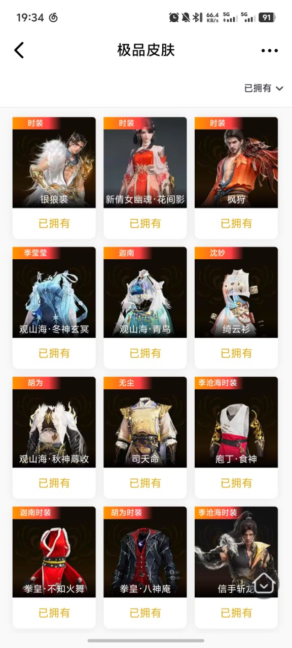 [11294419]红皮数: 11 金皮数量: 277 幻丝数: 64439 等级: 379 版本: 标准版 谪星金皮: 谪星·无定法*2 红皮: 戎金狼(特木尔皮肤),沙漠香风(迦南皮肤),蝶梦(胡桃皮肤),少阳剑(长剑皮肤),通天狐袄(玉玲珑皮肤),天琼(匕首皮肤),逆晦朔(扇皮肤),化道者(哈迪皮肤),赤皓新囍(宁红夜皮肤),天罚(火炮皮肤),逐光者(席拉皮肤) 宁红夜金皮: 九阴圣女,耀世魂花,夜华朝 特木尔金皮: 追猎,银狼裘,护世四法·多闻天王 迦南金皮: 火罗圣女,观山海·青鸟,长歌诗韵·胡旋女,拳皇·不知火舞 季沧海金皮: 游四海,庖丁·食神,信手斩龙,观山海·夏神祝融,巫师3·杰洛特 胡桃金皮: 御宅罗梦(白丝),清雅少女,贵胄少女,长歌诗韵·遣唐使 天海金皮: 若水尊者,九骊之君 崔三娘金皮: 夏日派对·弄潮逐浪,赤雾烟霞,观山海·文鳐,阿娜希塔,绿野守护·暗沼摩罗,庖丁·肴婵 岳山金皮: 弘毅袍,复制体·尼尔,长歌诗韵·戍关将 无尘金皮: 司天命,封神录·申公豹,黄庭道 顾清寒金皮: 赤丹朱湛 玉玲珑金皮: 黄昏巫主,封神录·妲己 武田信忠金皮: 麟鹿大铠,枫狩 殷紫萍金皮: 新倩女幽魂·花间影,智绘·萍之缘 沈妙金皮: 观山海·腓腓,绮云衫,街头狂欢·涂鸦少女,绿野守护·悠竹萌客,云溪仙子 胡为金皮: 观山海·秋神蓐收,街头狂欢·不败擂主,葫芦兄弟·蛤蟆头领,福瑞天泽,拳皇·八神庵 季莹莹金皮: 观山海·冬神玄冥 哈迪金皮: 夜绸袍,天工奥妙 刘炼金皮: 封神录·姜子牙 张起灵金皮: 绿野守护·山漠狞影 席拉金皮: 雪铃绮歌 飞索金皮: 毒刺 长剑金皮: 监星尺,隐锋,2674·原型,亢龙 太刀金皮: 雷赐,黑绳,鎏金勺 阔刀金皮: 雷王锯,龙蟠,青石猊,巫师3·看门人之铲 斩马刀金皮: 西行劫·三尖两刃刀,观山海·朱明,断月影 长枪金皮: 白虹,委蛇矛,建木,长虹,焦钰,银镰枪,观山海·金神钺,灵木角 棍金皮: 打狗棒,学宫之杖,护世四法·降魔,古格努斯杖 匕首金皮: 华夏神兵·马首刀,仙舞,桡尺刀 扇金皮: 逍遥,耀夜流华,腾云歌 双节棍金皮: 精武,镇魔杵,嘶风,月瞳 双刀金皮: 破重云,天威,蛋仔派对·咸鱼,空寒 双戟金皮: 观山海·水衡 横刀金皮: 烛泪,白鹿 拳刃金皮: 绿野守护·毛乎乎,无相印,醒狮 弓箭金皮: 仙毫,转轮弓,乌木弓