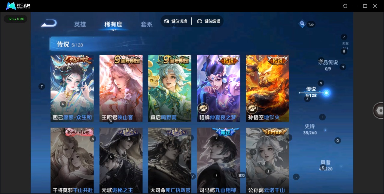 - PX_2017716-贵族等级: V5 英雄数: 110 皮肤数: 96 传说皮: 冠军飞将,云鹰飞将,妄想实况 限定皮: 李小龙,山海·玄木吟,鸣野蒿,逐霄战戟,愿照·九州拓