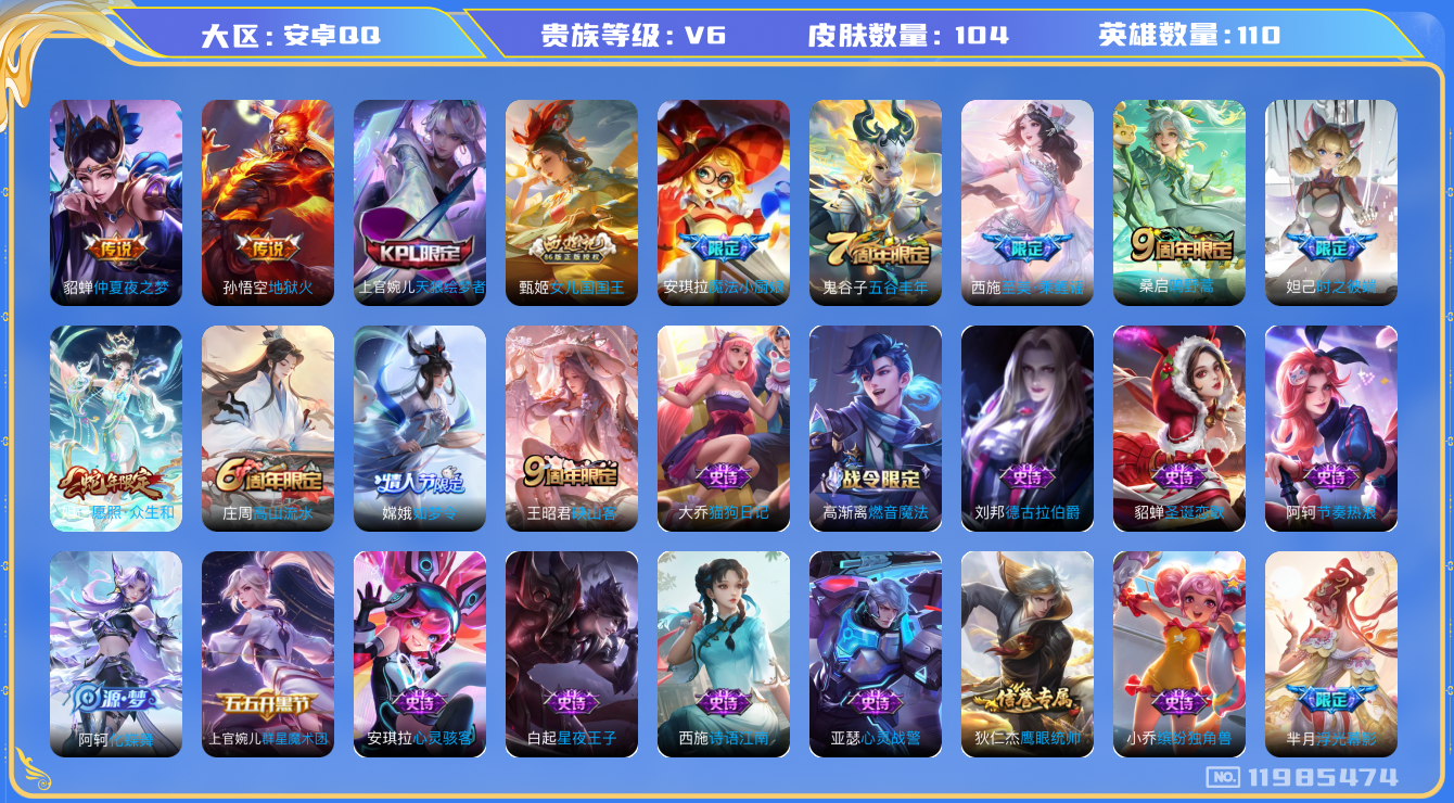 - [12116553]V7 1珍品传说 5传说 123英雄 188皮肤 可修改实名 优质装备:怪盗基德,超时空战士-狄仁杰,涂山容容 传说皮:幻光神枪 珍宝阁皮:万物之道,蔷薇恋人 限定皮:愿照·岁时盈(虞姬年限),鸣野蒿,瑞麟志(木兰年限),五谷丰年,游园惊梦,李小龙,大圣娶亲,深海之息(深海大菠萝) 史诗皮:器灵·浮梦炉,龙之律动,琥珀纪元伽罗,百相守梦-黄忠,蒙犽顽岩魄,怒海争锋,织梦人,紫霞仙子,电玩小子(小书包),白龙吟,黄金分割率,特工魅影,千年之狐,江河有灵,雪夜绮愿(周瑜),百解令(蒙犽),高渐离燃音魔法,蒙恬荣光圣徽,电玩·爆裂旋风,末日机甲-吕布,猫狗日记-大乔,乱世虎臣,节奏热浪,修罗,摇滚巨星,水果甜心,星夜王子,德古拉伯爵,暗隐猎兽者,幽灵船长,鬼剑武藏,心灵战警,纤云弄巧,缤纷独角兽,乘风破浪,逐浪之夏,水晶猎龙者,曙光守护者,箭羽风息,金属风暴,圣诞恋歌,鹰眼统帅,魅力维加斯,未来纪元-赵云
