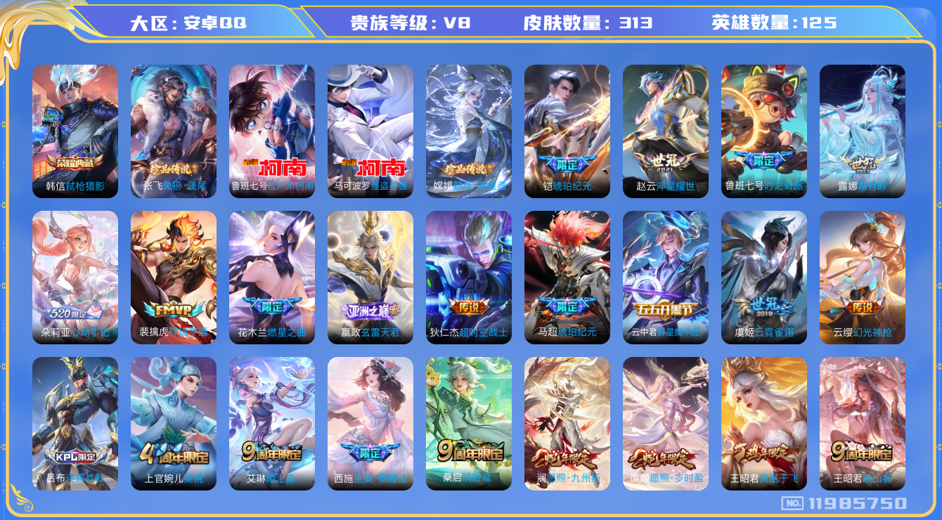 [11985750]V8 1典藏 4珍品传说 18传说 125英雄 313皮肤 可修改实名 优质装备:弑枪猎影(韩信典藏),江户川柯南,怪盗基德,器灵·落星盏,云霓雀翎,淬星耀世,超时空战士-狄仁杰,燃星之曲,鲁班七号-时之奇旅,霜月吟,琥珀纪元铠,琥珀纪元马超,云中君群星魔术团,朵莉亚心动手记,玄雷天君,涂山容容 珍品传说:兔狲·蓬尾 传说皮:祥瑞亨通,幻光神枪 珍宝阁皮:妄想食味,万物之道 限定皮:愿照·九州拓(澜年限),愿照·岁时盈(虞姬年限),逐霄战戟,映山客,陌上桑,鸣野蒿,凤凰于飞,至美·乘鲤谣,梁祝 史诗皮:鸭鸭历险记-刘禅,苍鳞隐世,器灵·浮梦炉,绮世丹青,化蝶舞,谪仙醉月,龙之律动,雪豹·霜爪,藏狐·褐绒,百相守梦-周瑜,茶境仙,幻珠鲛人,怒海争锋,芈月浮光幕影,海诺心动手记,琥珀纪元伽罗,上官婉儿群星魔术团,奇遇星旅,蔬乡物语(鲁班七号),乘龙·聚宝船(安琪拉年限),百相守梦-百里守约,百相守梦-黄忠,紫霞仙子,黄金分割率,特工魅影,千年之狐,江河有灵,匿光侦查者,百解令(蒙犽),高渐离燃音魔法,偶像歌手,白蛇,末日机甲-吕布,猫狗日记-大乔,时之恋人-孙尚香,节奏热浪,女仆咖啡,摇滚巨星,水果甜心,绅士熊喵,星夜王子,心灵骇客,功夫厨神,暗隐猎兽者,幽灵船长,鬼剑武藏,舞动绿茵,地狱岩魂,纤云弄巧,拒霜思,缤纷独角兽,乘风破浪,水晶猎龙者,曙光守护者,箭羽风息,唤灵魅影,金属风暴,圣诞恋歌,鹰眼统帅,暗夜贵公子,魅力维加斯,滕王阁序,未来纪元-赵云