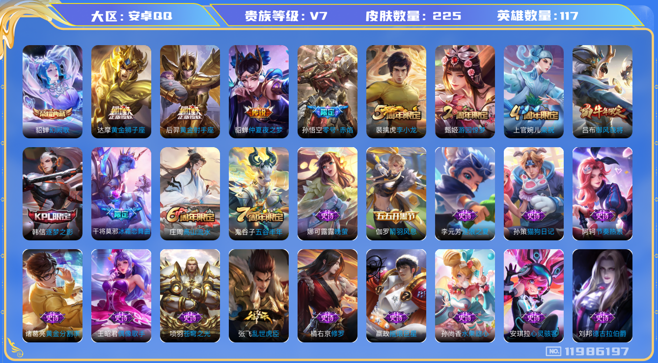 [11986197]【商品标题】:安卓Q-V4-永恒钻石III段位-117英雄-225皮肤-1典藏-0珍品无双-0无双-0珍品传说-4传说-56史诗