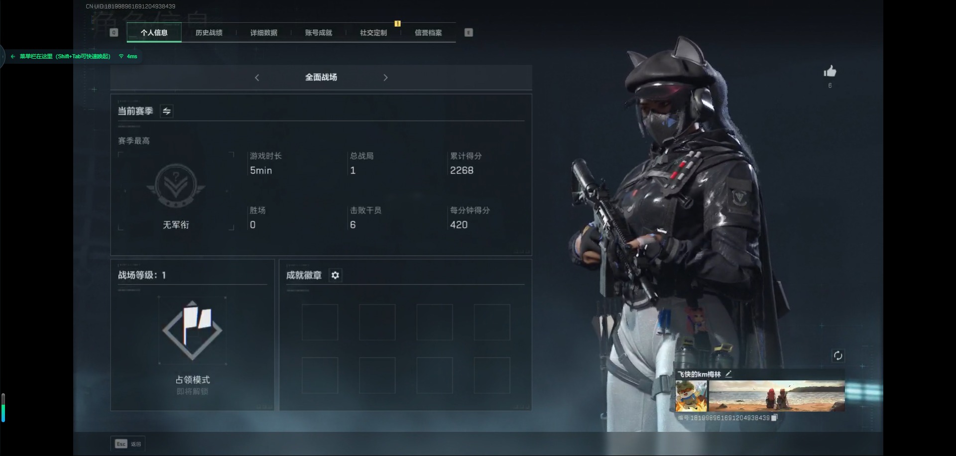 [11553795]总资产:305M 2干员外观 5传说枪械 哈夫币:210K 可二次 可修改实名 烽火地带段位:青铜 全面战场段位:无段位 传说武器皮肤:M16A4突击步枪-狩猎时刻,725双管霰弹枪-送葬人-无题密令,M4A1突击步枪-阿米娅,Vector冲锋枪-狩猎时刻,G3战斗步枪-狩猎时刻 史诗武器皮肤:PKM通用机枪-蝮蛇,SR-3M紧凑突击步枪-荒野求生,PKM通用机枪-荒野求生,SVD狙击步枪-荒野求生,PSG-1射手步枪-无垢,MP7冲锋枪-无垢,腾龙突击步枪-无垢,SV-98狙击步枪-林中猎手 干员外观:露娜-黑·天际线,蜂医-送葬人·无题密令(S5)