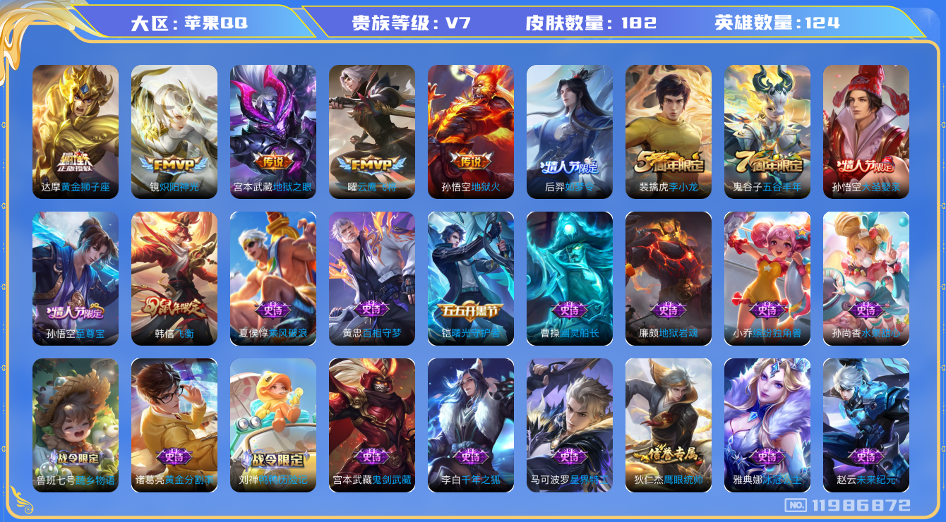 [11986872]V7 5传说 124英雄 182皮肤 可修改实名 优质装备:黄金狮子座,云鹰飞将(小将军),炽阳神光,地狱火,地狱之眼 珍宝阁皮:胡桃夹子 限定皮:至尊宝,飞衡(韩信年限),五谷丰年,李小龙,如梦令-后羿,大圣娶亲 史诗皮:鸭鸭历险记-刘禅,龙之律动,蔬乡物语(鲁班七号),星界特工,百相守梦-黄忠,黄金分割率,特工魅影,千年之狐,冰冠公主,百相守梦(关羽),修罗,水果甜心,幽灵船长,鬼剑武藏,地狱岩魂,纤云弄巧,繁星吟游(呼啦呼啦),缤纷独角兽,乘风破浪,曙光守护者,金属风暴,鹰眼统帅,黎明之约,赏金猎手,未来纪元-赵云