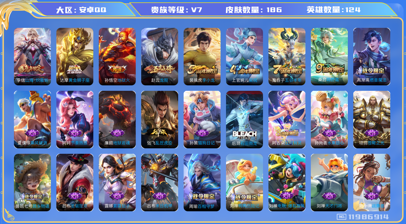 [11986914]V7 4传说 124英雄 186皮肤 可修改实名 优质装备:黄金狮子座,地狱火,山海·炽霜斩(李信年限) 珍宝阁皮:玩趣恶龙 限定皮:鸣野蒿,五谷丰年,梁祝,龙胆,李小龙 史诗皮:鸭鸭历险记-刘禅,龙之律动,石田雨龙,百相守梦-周瑜,破空之剑,战舞者,蔬乡物语(鲁班七号),紫霞仙子,苍穹之光,特工魅影,千年之狐,江河有灵,真我赫兹(百里守约),高渐离燃音魔法,蒙恬荣光圣徽,冰冠公主,电玩·爆裂旋风,末日机甲-吕布,猫狗日记-孙策,乱世虎臣,节奏热浪,女仆咖啡,摇滚巨星,水果甜心,天才门将,暗隐猎兽者,鬼剑武藏,心灵战警,天秀·启明,地狱岩魂,乘风破浪,金属风暴,原初追逐者,圣诞狂欢,鹰眼统帅,魅力维加斯,无心