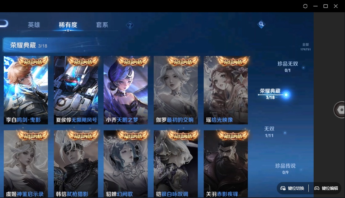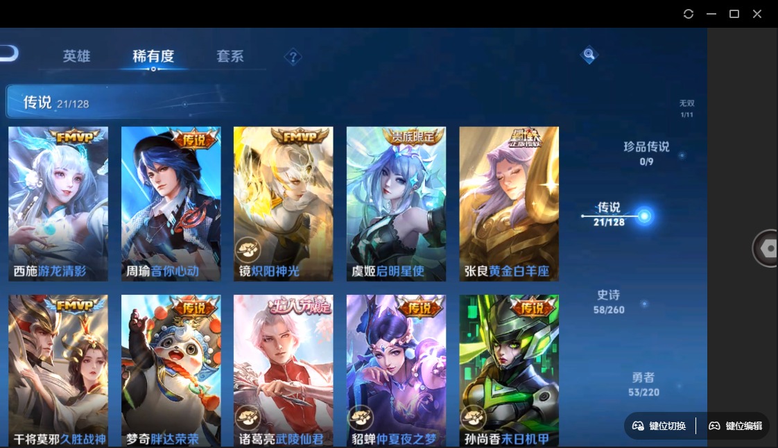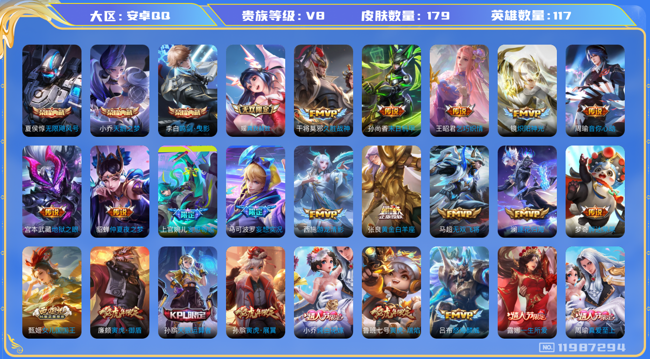 - [11529503]V8 1典藏 2珍品传说 11传说 126英雄 334皮肤 典藏英雄武则天 可修改实名 优质装备:鸣剑·曳影,江户川柯南,怪盗基德,云鹰飞将(小将军),地狱火,地狱之眼,乞巧织情,电玩·雷克斯,涂山容容 传说皮:幻光神枪 珍宝阁皮:蔷薇恋人,女武神 限定皮:愿照·岁时盈(虞姬年限),愿照·众生和(妲己年限),逐霄战戟,鸣野蒿,至尊宝,时雨天司(水龙头),遇见飞天,五谷丰年,游园惊梦,梁祝,逐梦之星,天狼溯光者,辉光之辰,大圣娶亲 史诗皮:鸭鸭历险记-刘禅,化蝶舞,灵蛊蚀心,星界战将,龙之律动,石田雨龙,百相守梦-周瑜,茶境仙,破空之剑,蒙犽顽岩魄,蔬乡物语(鲁班七号),百相守梦-百里守约,百相守梦-黄忠,织梦人,遇见神鹿,紫霞仙子,电玩小子(小书包),黄金分割率,特工魅影,千年之狐,江河有灵,魅语,百解令(蒙犽),高渐离燃音魔法,蒙恬荣光圣徽,冰冠公主,青蛇,偶像歌手,电玩·兔顽号,电玩·爆裂旋风,龙骑士(小龙虾),末日机甲-吕布,猫狗日记-孙策,猫狗日记-大乔,时之恋人-孙尚香,乱世虎臣,节奏热浪,女仆咖啡,摇滚巨星,水果甜心,绅士熊喵,天才门将,星夜王子,心灵骇客,功夫厨神,德古拉伯爵,暗隐猎兽者,幽灵船长,鬼剑武藏,心灵战警,乐园奇幻夜,天秀·启明,地狱岩魂,纤云弄巧,繁星吟游(呼啦呼啦),拒霜思,缤纷独角兽,乘风破浪,逐浪之夏,水晶猎龙者,曙光守护者,箭羽风息,金属风暴,圣诞狂欢,圣诞恋歌,鹰眼统帅,暗夜贵公子,魅力维加斯,黎明之约,未来纪元-赵云