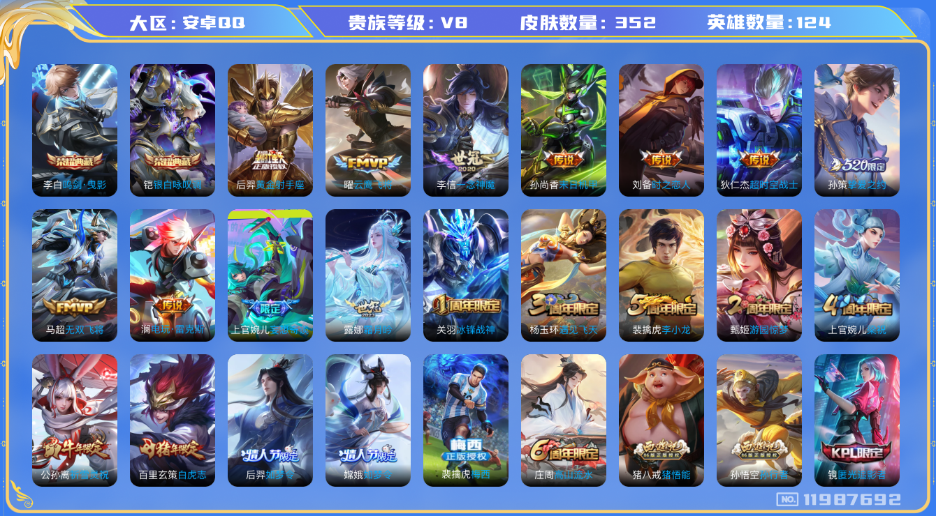 [11987692]【商品标题】:安卓Q-V8-最强王者段位-124英雄-352皮肤-2典藏-0珍品无双-0无双-0珍品传说-19传说-100史诗
