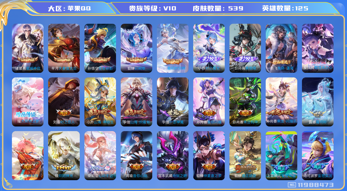 [11988473]V10 5典藏 2无双 3珍品传说 72传说 125英雄 539皮肤 可修改实名 优质装备:大秦宣太后,全息碎影(猴子典藏),星域神启(倪克斯贼亮),幻阙歌(貂蝉典藏),小乔时之魔女(小乔无双),离恨烟(公孙离无双),最初的交响(伽罗典藏),酷洛米之心,大耳狗之梦,黄金狮子座,云鹰飞将(小将军),黄金白羊座,久胜战神,炽阳神光,一念神魔,云霓雀翎,末日机甲-孙尚香(绿蚂蚱),仲夏夜之梦(大飞蛾),地狱之眼,飞鸢探春,音你心动-周瑜,乞巧织情,时之恋人-刘备(电焊工),游龙清影(小青龙),淬星耀世,超时空战士-狄仁杰,遇见胡旋,花朝如约(花篮子),无双飞将,音你闪耀(rap皮),碎云,山海·炽霜斩(李信年限),山海·琳琅生(小乔年限),山海·苍雷引(电光曜子),浮生妄,记忆之芯(机甲兔),妄想实况,妄想奇谈,鲁班七号-时之奇旅,大乔-时之奇旅,永恒水手月亮,夜礼服假面,小动物乐团,霜月吟,澜逐花归海,艾琳觅芳踪,琥珀纪元铠,琥珀纪元马超,金乌负日,朵莉亚心动手记,牧神诗旅 珍品传说:兔狲·蓬尾 传说皮:乘龙·问璇玑(孙尚香年限),乘龙·铭钟鼎(赵云年限),乘龙·淬吴钩(孙策年限),典韦战鼓燎原,落雪白狼,铠冥王哈迪斯,幻光神枪 珍宝阁皮:妄想食味,胡桃夹子,蔷薇恋人 限定皮:愿照·九州拓(澜年限),愿照·福禄聚(蔡文姬年限),愿照·岁时盈(虞姬年限),愿照·山河定(司空震年限),愿照·众生和(妲己年限),愿照·千秋盛(女娲年限),逐霄战戟,映山客,鸣野蒿,夏侯惇霜北刀,至尊宝,太华(伽罗年限),傲雪梅枪,补天,寅虎·展翼(孙膑年限),前尘镜,绯月行,时之彼端,魔法小厨娘,白晶晶,时雨天司(水龙头),山海·碧波行(瑶年限),瑞麟志(木兰年限),至美·乘鲤谣,至美·化雀舞,遇见飞天,高山流水,诗剑行,怒海麟威,五谷丰年,冰锋战神,天狼运算者,游园惊梦,梁祝,御风骁将(吕布年限),龙胆,逐梦之星,岱宗(典韦年限),天狼溯光者,逐梦之音,奔雷神使(牛魔年限),祈雪灵祝(雪兔子),天狼绘梦者,李小龙,朱雀志(守约年限),如梦令-嫦娥,霸王别姬-项羽,霸王别姬-虞姬,默契交锋-花木兰,孙行者,猪悟能,蜜橘之夏,热情桑巴,寅虎·心曲(虎婆),寅虎·赤拳(老虎年限),玉兔公主,启示之音,无尽星芒,深海之息(深海大菠萝),唐三藏,梦圆繁星,山海·玄木吟(马可年限) 史诗皮:鸭鸭历险