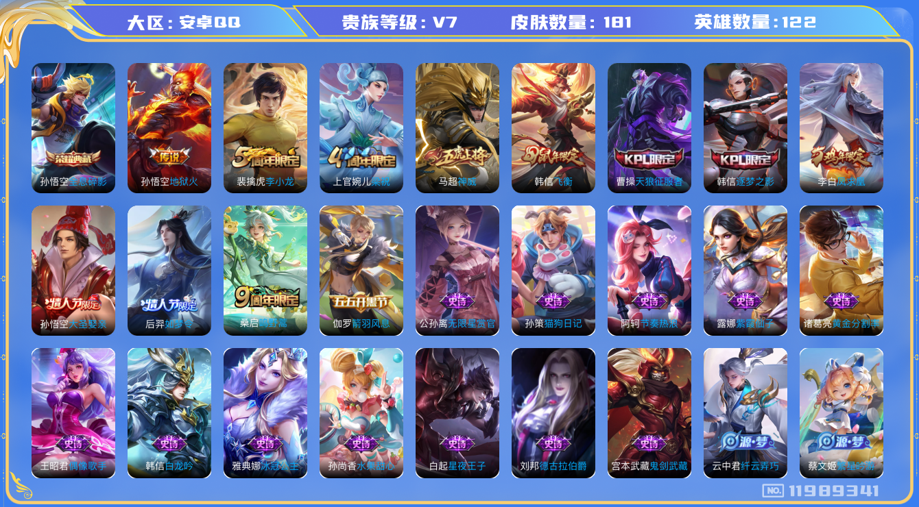 [11989341]【商品标题】:安卓Q-V7-至尊星耀V段位-122英雄-181皮肤-1典藏-0珍品无双-0无双-0珍品传说-3传说-41史诗