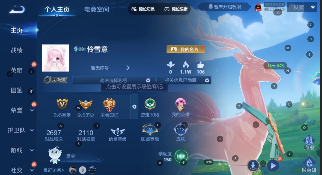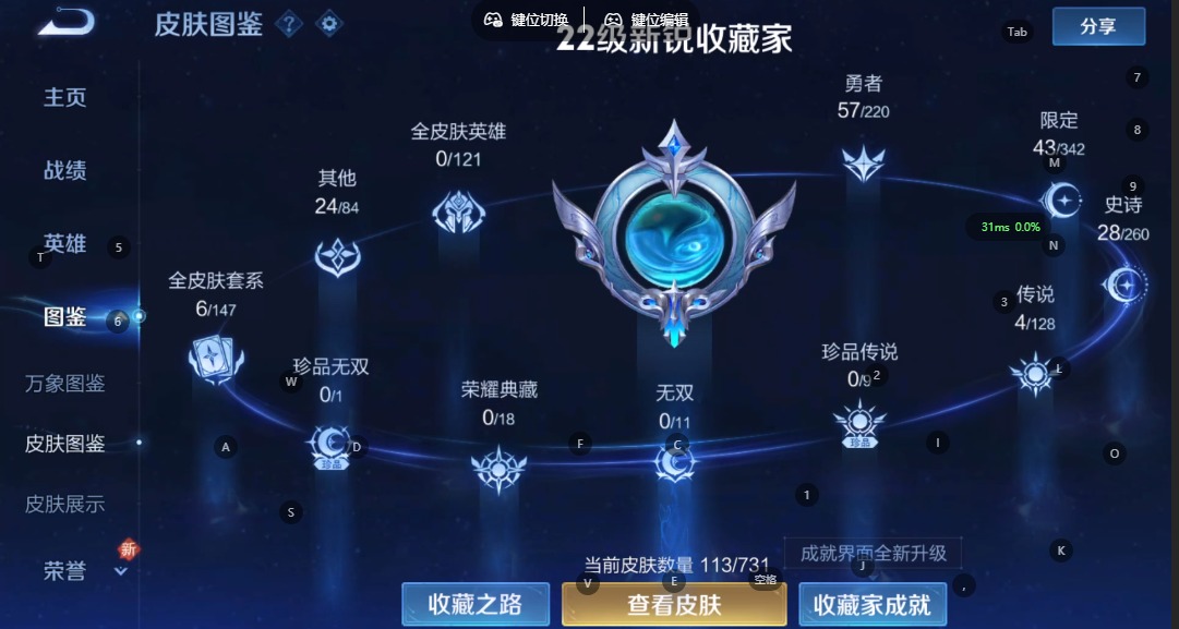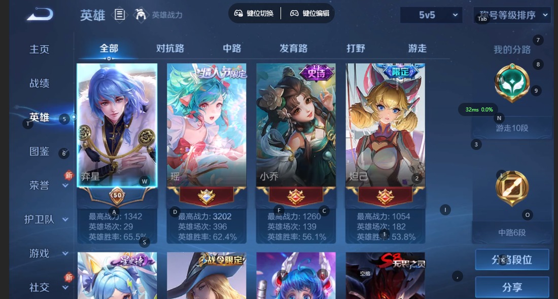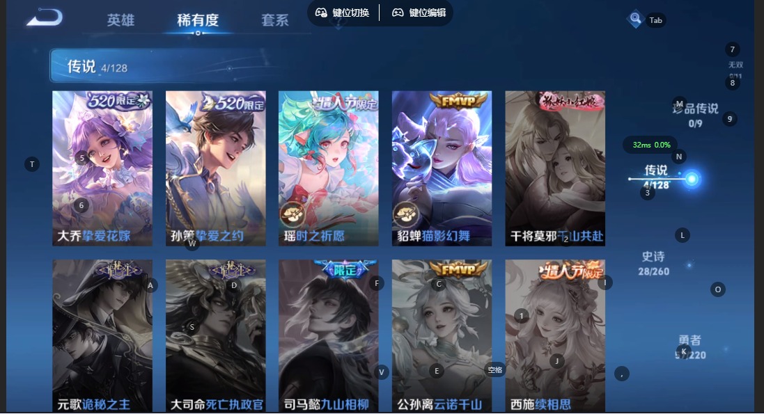 - PX_2062089-实名: 可修改 贵族等级: V6 英雄数: 122 皮肤数: 161 星传说: 金色仲夏夜 传说皮: 云鹰飞将,猫影幻舞,仲夏夜之梦,零号·赤焰,貂蝉曦玄引,续相思 限定皮: 遇见飞天,李小龙,梁祝,高山流水,时之奇旅-妲己,五谷丰年,山海·玄木吟,至美·乘鲤谣