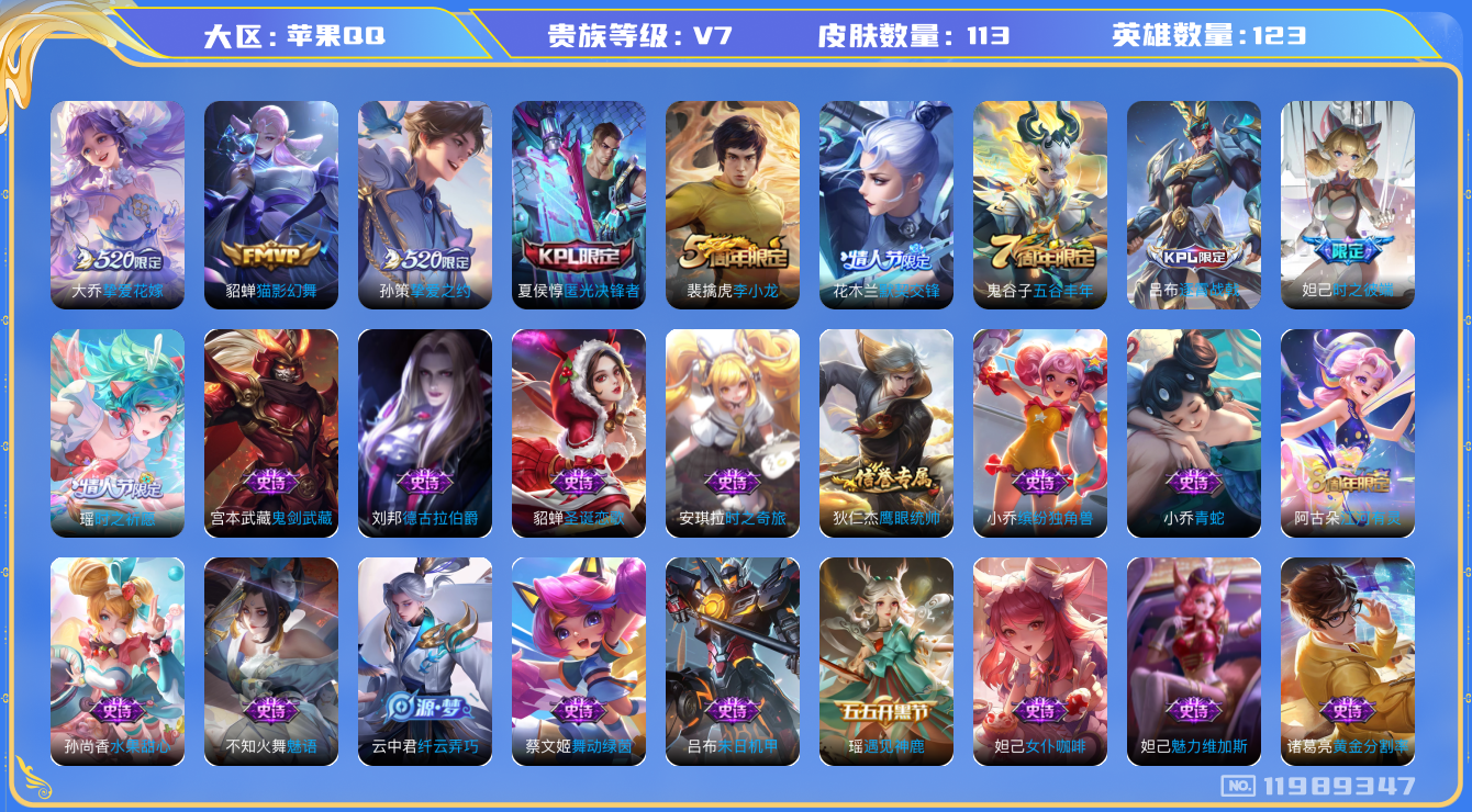 - [12202457]V7 10传说 121英雄 198皮肤 可修改实名 优质装备:一念神魔,零号·赤焰,无双飞将,画中仙 珍宝阁皮:妄想食味,女武神,玩趣恶龙 限定皮:愿照·山河定(司空震年限),逐霄战戟,鸣野蒿,至尊宝,白虎志(电光耗子),凤求凰(白切鸡),时雨天司(水龙头),神威(电光马子),飞衡(韩信年限),高山流水,怒海麟威,五谷丰年,烈魂,李小龙,孙行者,猪悟能 史诗皮:苍鳞隐世,器灵·浮梦炉,茶境仙,星界特工,百相守梦-百里守约,紫霞仙子,黄金分割率,蒙恬荣光圣徽,猫狗日记-孙策,猫狗日记-大乔,时之恋人-孙尚香,节奏热浪,修罗,女仆咖啡,摇滚巨星,水果甜心,星夜王子,功夫厨神,幽灵船长,鬼剑武藏,心灵战警,舞动绿茵,纤云弄巧,繁星吟游(呼啦呼啦),拒霜思,缤纷独角兽,乘风破浪,逐浪之夏,水晶猎龙者,热力回旋,金属风暴,圣诞狂欢,圣诞恋歌,鹰眼统帅,魅力维加斯,黎明之约,未来纪元-赵云