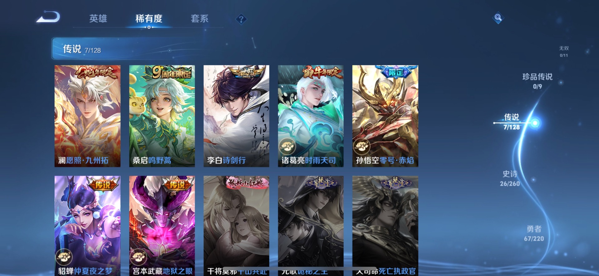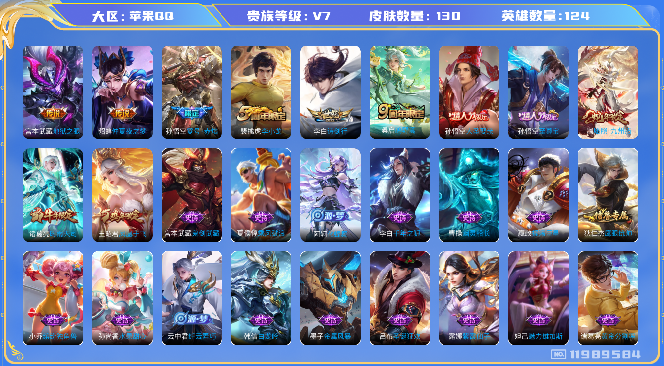 - [11657339]V9 4典藏 25传说 126英雄 366皮肤 典藏英雄武则天 可修改实名 优质装备:鸣剑·曳影,全息碎影(猴子典藏),九霄神辉(木兰典藏),弑枪猎影(韩信典藏),冠军飞将,云鹰飞将(小将军),久胜战神,一念神魔,地狱火,仲夏夜之梦(大飞蛾),海洋之心,音你心动-周瑜,淬星耀世,超时空战士-狄仁杰,音你闪耀(rap皮),碎云,山海·炽霜斩(李信年限),山海·苍雷引(电光曜子),画中仙,鹤归松栖(云缨) 珍宝阁皮:优雅恋人,蔷薇恋人,女武神 限定皮:鸣野蒿,至尊宝,凤求凰(白切鸡),太华(伽罗年限),武陵仙君(小桃花),时雨天司(水龙头),高山流水,诗剑行,怒海麟威,五谷丰年,青龙志(铠年限),梁祝,天狼溯光者,李小龙,朱雀志(守约年限),如梦令-后羿,孙行者,猪悟能,大圣娶亲,寅虎·御盾(廉颇年限),深海之息(深海大菠萝),冰霜神祇 史诗皮:鸭鸭历险记-刘禅,化蝶舞,灵蛊蚀心,星界战将,怒海争锋,百相守梦-黄忠,遇见神鹿,紫霞仙子,苍穹之光,电玩小子(小书包),白龙吟,黄金分割率,特工魅影,千年之狐,永昼,江河有灵,闲日渔趣,魅语,百解令(蒙犽),蒙恬荣光圣徽,冰冠公主,青蛇,偶像歌手,电玩·爆裂旋风,暗夜猫娘,龙骑士(小龙虾),末日机甲-吕布,猫狗日记-孙策,猫狗日记-大乔,时之恋人-孙尚香,乱世虎臣,节奏热浪,修罗,女仆咖啡,摇滚巨星,水果甜心,绅士熊喵,天才门将,星夜王子,心灵骇客,功夫厨神,德古拉伯爵,暗隐猎兽者,幽灵船长,鬼剑武藏,暗渊魔法,心灵战警,乐园奇幻夜,舞动绿茵,地狱岩魂,纤云弄巧,繁星吟游(呼啦呼啦),拒霜思,缤纷独角兽,乘风破浪,逐浪之夏,水晶猎龙者,曙光守护者,热力回旋,箭羽风息,金属风暴,原初追逐者,圣诞狂欢,圣诞恋歌,鹰眼统帅,暗夜贵公子,魅力维加斯,黎明之约,赏金猎手,寅虎·御盾,无心,未来纪元-赵云