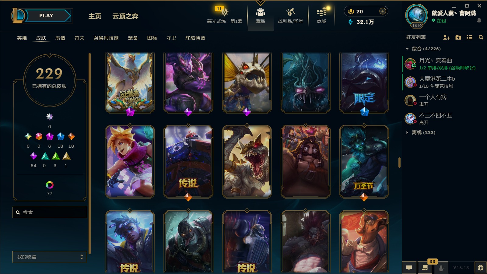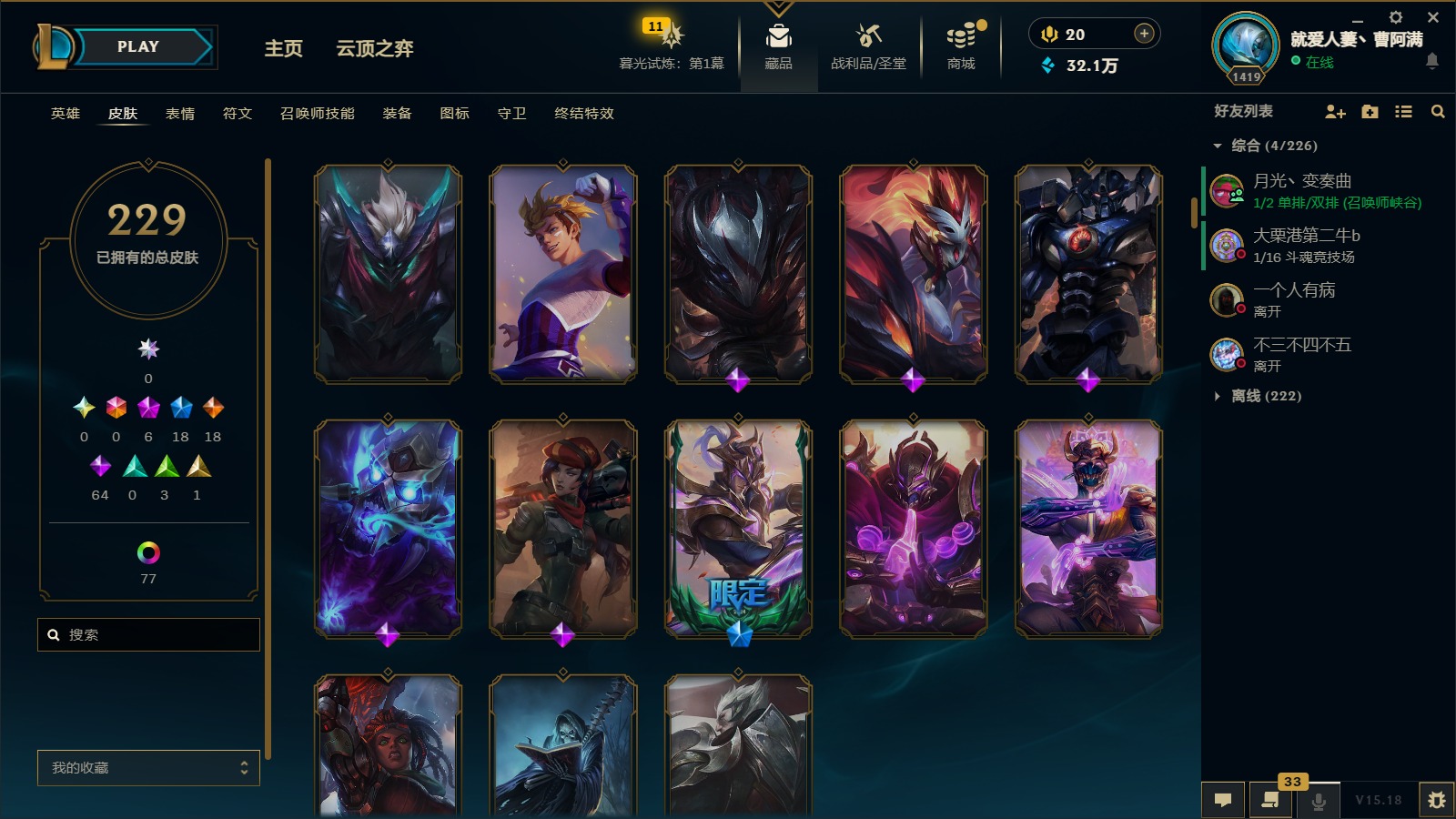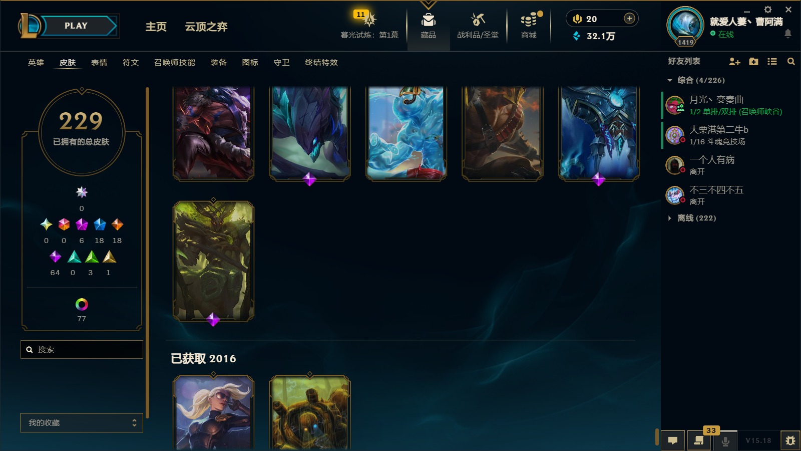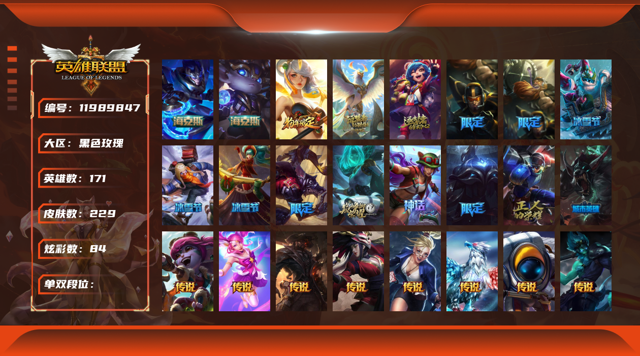 [11989847]6神话 18限定 18传说 64史诗 229皮肤 84炫彩 171英雄 可二次 可修改实名 优质装备:源代码 乐芙兰,防爆天使 凯尔,暗影 沃里克,都铎王朝 图奇,冠军之隐 劫,冠军之血 希瓦娜 凯旋圣装,净雪之月 莫甘娜 冬虹,十五周年纪念 希维尔,魔女 阿卡丽 虚荣 海克斯:海克斯 嘉文四世,海克斯 波比 赛季限定皮:胜利凤凰 艾尼维亚,胜利之运 崔斯特,胜利剑圣 易,胜利女神 娑娜,胜利巨口 克格莫,胜利之王 泰达米尔,胜利机器人 布里茨,胜利女神 瑟庄妮 冠军限定系列:S1FNC 酒桶,S1FNC 嘉文四世 冰雪节限定:冰雪节 炼金,平安夜女神 娑娜,邪恶圣诞老人 维迦 年限:狗年 光辉 周年:10周年 安妮,10周年 凤凰