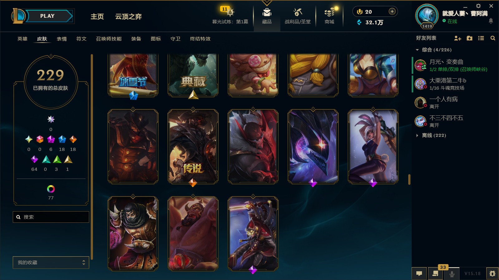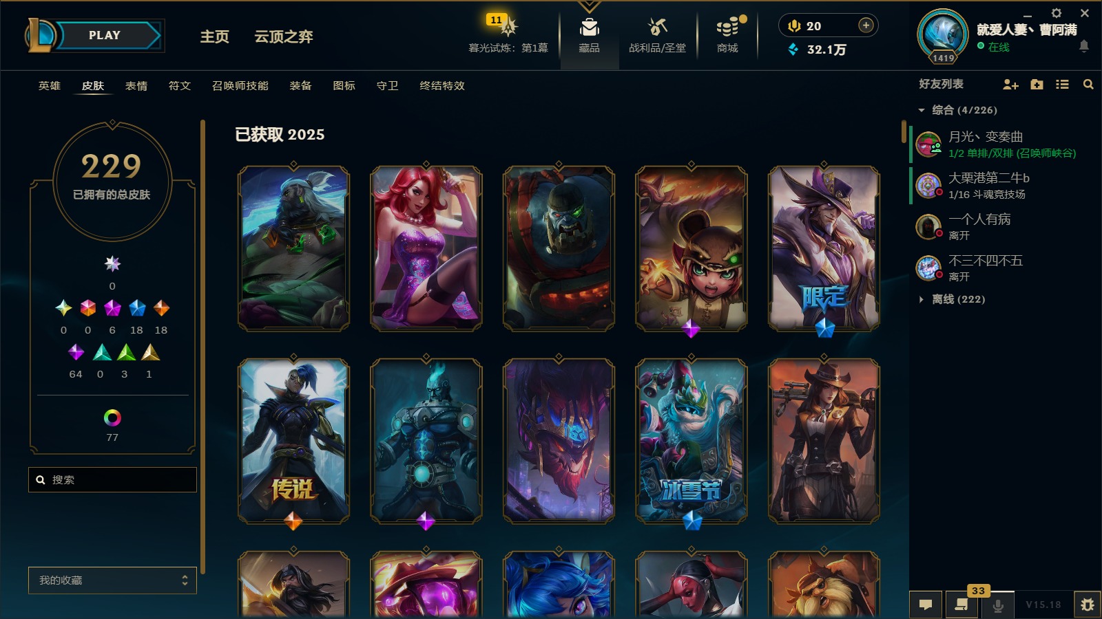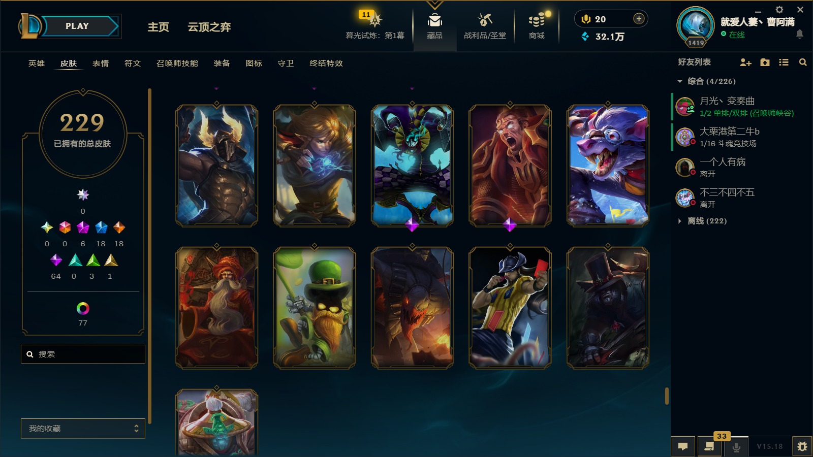 [11989847]6神话 18限定 18传说 64史诗 229皮肤 84炫彩 171英雄 可二次 可修改实名 优质装备:源代码 乐芙兰,防爆天使 凯尔,暗影 沃里克,都铎王朝 图奇,冠军之隐 劫,冠军之血 希瓦娜 凯旋圣装,净雪之月 莫甘娜 冬虹,十五周年纪念 希维尔,魔女 阿卡丽 虚荣 海克斯:海克斯 嘉文四世,海克斯 波比 赛季限定皮:胜利凤凰 艾尼维亚,胜利之运 崔斯特,胜利剑圣 易,胜利女神 娑娜,胜利巨口 克格莫,胜利之王 泰达米尔,胜利机器人 布里茨,胜利女神 瑟庄妮 冠军限定系列:S1FNC 酒桶,S1FNC 嘉文四世 冰雪节限定:冰雪节 炼金,平安夜女神 娑娜,邪恶圣诞老人 维迦 年限:狗年 光辉 周年:10周年 安妮,10周年 凤凰