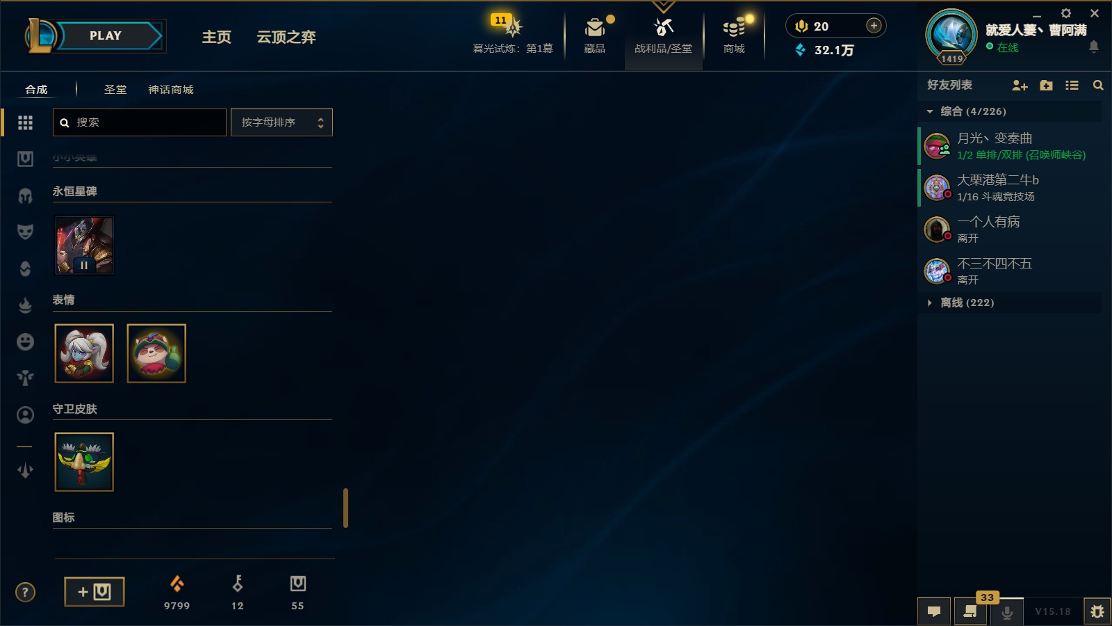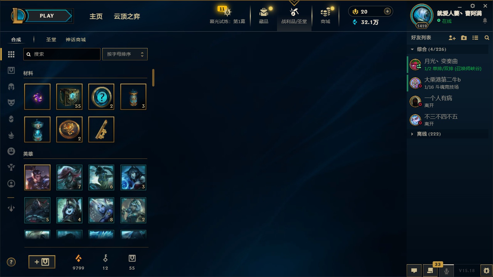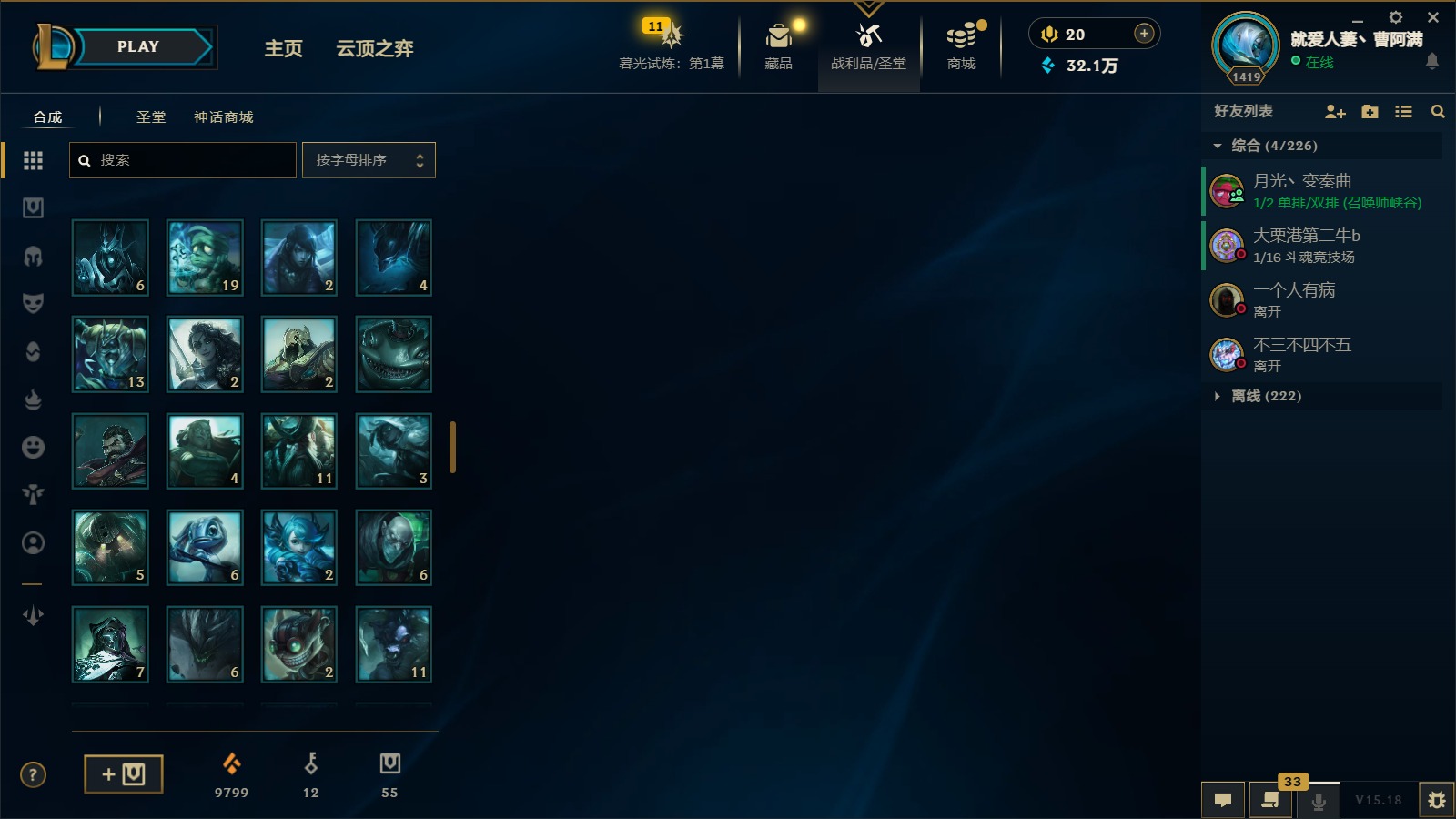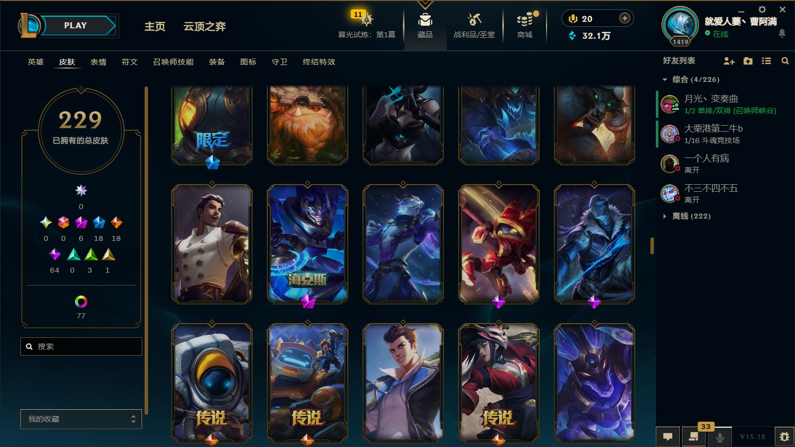 [11989847]6神话 18限定 18传说 64史诗 229皮肤 84炫彩 171英雄 可二次 可修改实名 优质装备:源代码 乐芙兰,防爆天使 凯尔,暗影 沃里克,都铎王朝 图奇,冠军之隐 劫,冠军之血 希瓦娜 凯旋圣装,净雪之月 莫甘娜 冬虹,十五周年纪念 希维尔,魔女 阿卡丽 虚荣 海克斯:海克斯 嘉文四世,海克斯 波比 赛季限定皮:胜利凤凰 艾尼维亚,胜利之运 崔斯特,胜利剑圣 易,胜利女神 娑娜,胜利巨口 克格莫,胜利之王 泰达米尔,胜利机器人 布里茨,胜利女神 瑟庄妮 冠军限定系列:S1FNC 酒桶,S1FNC 嘉文四世 冰雪节限定:冰雪节 炼金,平安夜女神 娑娜,邪恶圣诞老人 维迦 年限:狗年 光辉 周年:10周年 安妮,10周年 凤凰