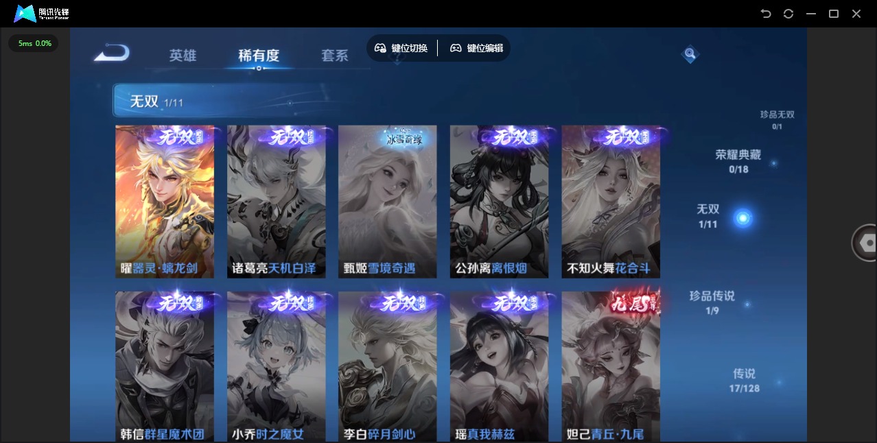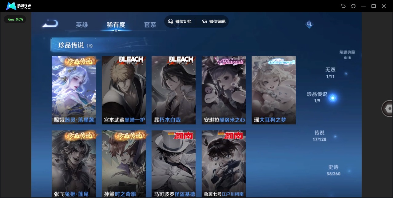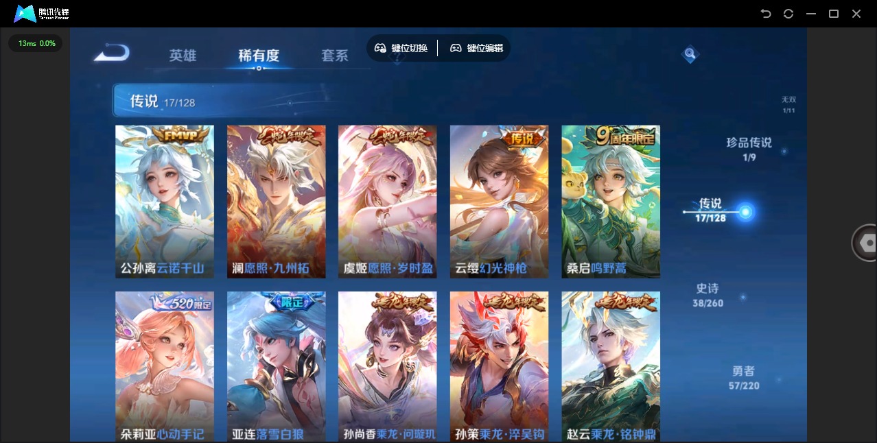 - [11680952]V9 4典藏 4珍品传说 13传说 125英雄 390皮肤 可修改实名 优质装备:无限飓风号(高达),银白咏叹调(倪克斯侍卫),神鉴启示录,最初的交响(伽罗典藏),江户川柯南,怪盗基德,黑崎一护,绛天战甲(鸡嘴战神),零号·赤焰,胖达荣荣,花朝如约(花篮子),神器·狴犴令,山海·炽霜斩(李信年限),妄想实况,牧神诗旅 珍品传说:兔狲·蓬尾 传说皮:典韦战鼓燎原,幻光神枪 珍宝阁皮:妄想食味,女武神,玩趣恶龙 限定皮:逐霄战戟,鸣野蒿,傲雪梅枪,时之彼端,怒海麟威,降魔,五谷丰年,冰锋战神,御风骁将(吕布年限),龙胆,烈魂,岱宗(典韦年限),天狼溯光者,天狼征服者,奔雷神使(牛魔年限),李小龙,辉光之辰,如梦令-后羿,霸王别姬-项羽,霸王别姬-虞姬,引擎之心,冰霜恋舞曲,寅虎·御盾(廉颇年限),百木心枪,梦圆繁星,山海·玄木吟(马可年限) 史诗皮:鸭鸭历险记-刘禅,苍鳞隐世,器灵·浮梦炉,化蝶舞,星界特工,灵蛊蚀心,龙之律动,藏狐·褐绒,小牛鸭,石田雨龙,茶境仙,撼地雄心,破空之剑,芈月浮光幕影,谪仙醉月,蔬乡物语(鲁班七号),琥珀纪元伽罗,百相守梦-百里守约,百相守梦-黄忠,遇见神鹿,紫霞仙子,苍穹之光,电玩小子(小书包),白龙吟,黄金分割率,特工魅影,千年之狐,永昼,电玩·爆裂旋风,江河有灵,雪夜绮愿(周瑜),百解令(蒙犽),高渐离燃音魔法,蒙恬荣光圣徽,偶像歌手,无限星赏官,晚萤,冰冠公主,青蛇,末日机甲-吕布,猫狗日记-孙策,猫狗日记-大乔,时之恋人-孙尚香,乱世虎臣,节奏热浪,修罗,女仆咖啡,摇滚巨星,水果甜心,绅士熊喵,天才门将,星夜王子,心灵骇客,时之奇旅-安琪拉,功夫厨神,德古拉伯爵,暗隐猎兽者,幽灵船长,鬼剑武藏,心灵战警,天秀·启明,舞动绿茵,地狱岩魂,诗语江南,纤云弄巧,拒霜思,缤纷独角兽,乘风破浪,逐浪之夏,月团寄思,水晶猎龙者,曙光守护者,箭羽风息,金属风暴,圣诞狂欢,圣诞恋歌,鹰眼统帅,暗夜贵公子,魅力维加斯,寅虎·御盾,无心,未来纪元-赵云