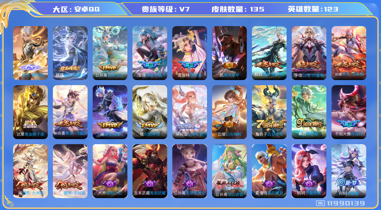[11990139]V7 1无双 1珍品传说 17传说 123英雄 135皮肤 可修改实名 优质装备:器灵·螭龙剑,器灵·落星盏,黄金狮子座,绛天战甲(鸡嘴战神),炽阳神光,山海·炽霜斩(李信年限),浮生妄,澜逐花归海,朵莉亚心动手记,涂山容容 传说皮:乘龙·问璇玑(孙尚香年限),乘龙·铭钟鼎(赵云年限),乘龙·淬吴钩(孙策年限),落雪白狼,云诺千山,幻光神枪 珍宝阁皮:妄想食味 限定皮:愿照·九州拓(澜年限),愿照·岁时盈(虞姬年限),鸣野蒿,绯月行,五谷丰年 史诗皮:化蝶舞,星界战将,龙之律动,雪豹·霜爪,紫霞仙子,黄金分割率,魅语,蒙恬荣光圣徽,无限星赏官,冰冠公主,偶像歌手,晚萤,末日机甲-吕布,猫狗日记-大乔,乱世虎臣,节奏热浪,水果甜心,天才门将,心灵骇客,功夫厨神,幽灵船长,鬼剑武藏,心灵战警,舞动绿茵,地狱岩魂,乘风破浪,逐浪之夏,水晶猎龙者,金属风暴,暗夜贵公子,魅力维加斯,赏金猎手