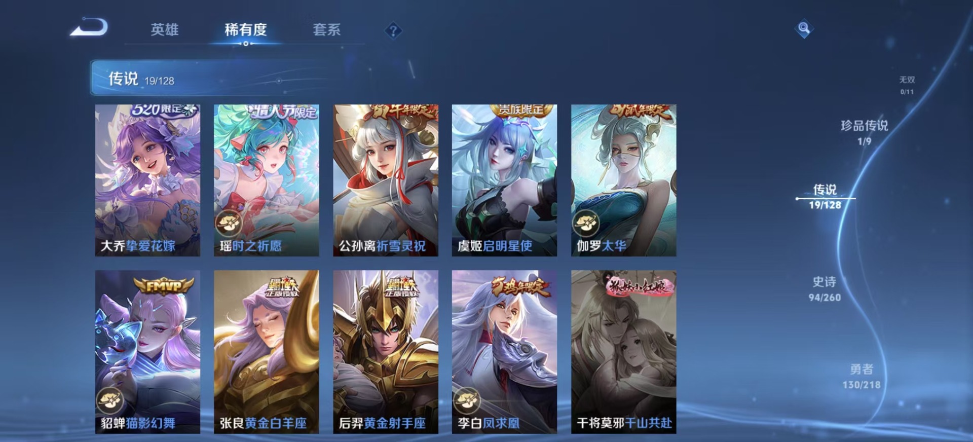 伽罗太华,小乔纯白花嫁,露娜一生所爱,镜匿光追影者,公孙离祈雪灵祝,公孙离玉兔公主,裴擒虎李小龙,裴擒虎天狼狩猎者,上官婉儿梁祝,花木兰瑞麟志,桑启鸣野蒿,女娲愿照·千秋盛,孙悟空孙行者,马超神威,云中君时之祈愿,妲己时之彼端,妲己愿照·众生和,百里守约朱雀志,蔡文姬奇迹圣诞,蔡文姬愿照·福禄聚,瑶时之祈愿,瑶山海·碧波行,澜愿照·九州拓,虞姬愿照·岁时盈,妲己热情桑巴,嫦娥如梦令
