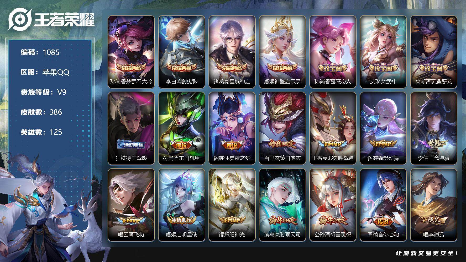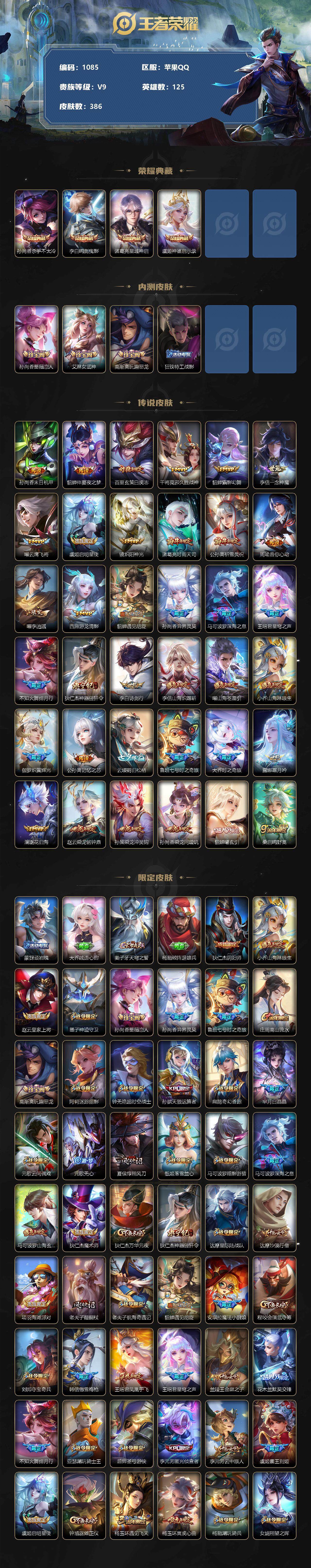 [11990790]【商品标题】:苹果Q-V9-至尊星耀II段位-125英雄-386皮肤-4典藏-0珍品无双-0无双-0珍品传说-36传说-118史诗