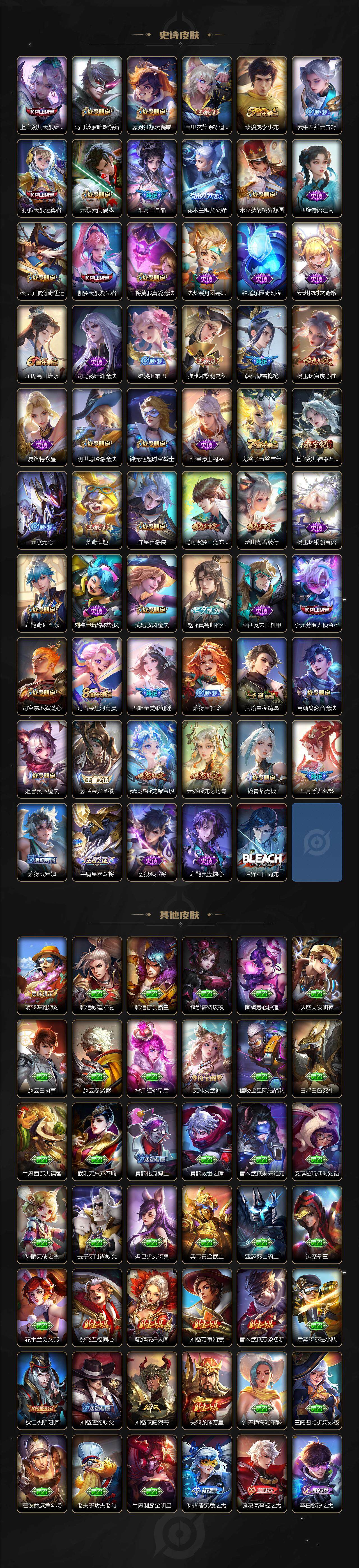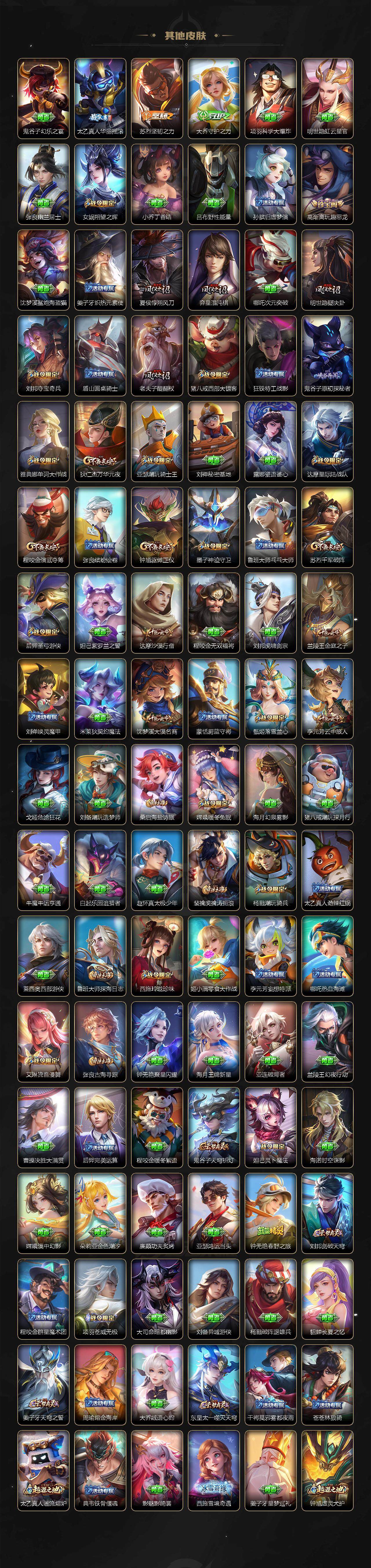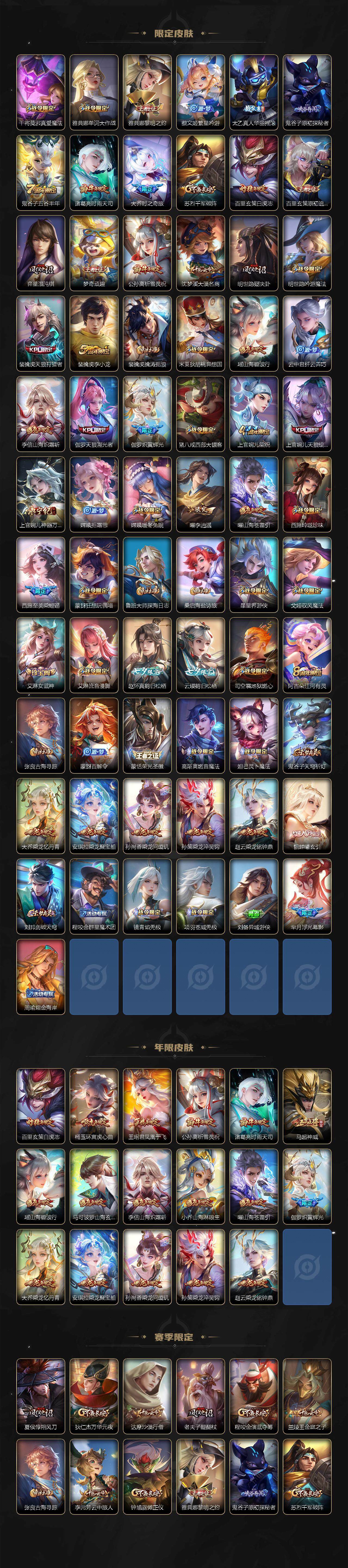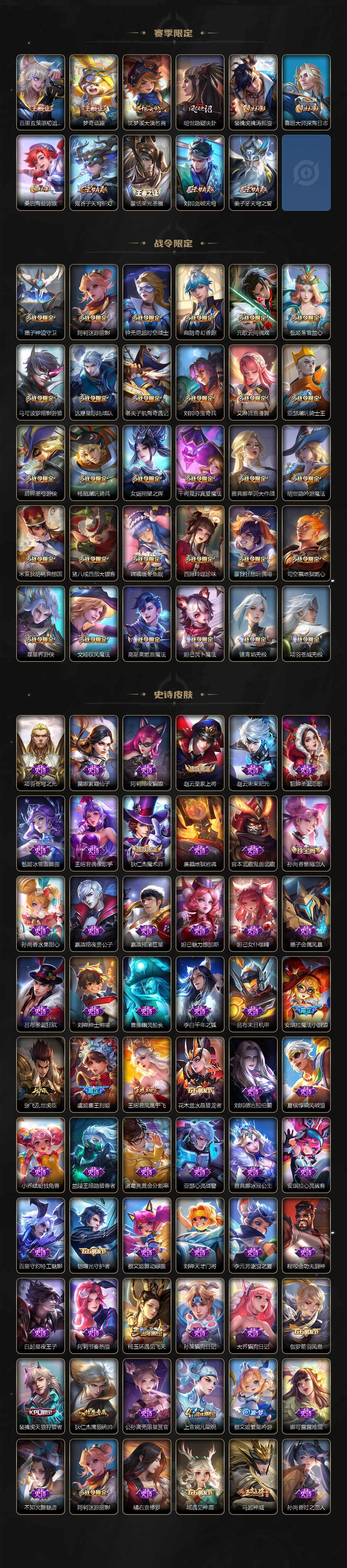 【限定皮肤】:蒙犽顽岩魄,大乔绒语心约,姜子牙天穹之誓,杨戬破阵退雄兵,狄仁杰阴阳师,小乔山海琳琅生,赵云皇家上将,墨子神迹守卫,孙尚香蔷薇恋人,孙尚香异界灵契,鲁班七号时之奇旅,庄周高山流水,高渐离玩趣恶龙,阿轲迷踪丽影,钟无艳超时空战士,孙膑天狼运算者,扁鹊奇幻香踪,芈月白晶晶,元歌云间偶戏,元歌无心,夏侯惇朔风刀,甄姬落雪兰心,马可波罗暗影游猎,马可波罗深海之息,马可波罗山海玄木吟,狄仁杰魔术师,狄仁杰万华元夜,狄仁杰神器狴犴令,达摩星际陆战队,达摩沙漠行僧,项羽海滩派对,老夫子醍醐杖,老夫子航海奇遇记,貂蝉遇见胡旋,安琪拉魔法小厨娘,程咬金演武夺筹,刘邦夺宝奇兵,韩信傲雪梅枪,王昭君凤凰于飞,王昭君星穹之声,兰陵王金庭之子,花木兰默契交锋,不知火舞绯月行,亚瑟潮玩骑士王,后羿圣弓游侠,李元芳匿光侦查者,李元芳云中旅人,虞姬霸王别姬,虞姬启明星使,钟馗驱傩正仪,杨玉环遇见飞天,杨玉环寅虎心曲,杨戬潮玩骑兵,女娲朔望之晖,干将莫邪真爱魔法,雅典娜单词大作战,雅典娜黎明之约,蔡文姬繁星吟游,太乙真人华丽摇滚,鬼谷子原初探秘者,鬼谷子五谷丰年,诸葛亮时雨天司,大乔时之奇旅,苏烈千军破阵,百里玄策白虎志,百里玄策原初追逐者,弈星混沌棋,梦奇顽趣,公孙离祈雪灵祝,沈梦溪大漠名商,明世隐疑决卦,明世隐吟游魔法,裴擒虎天狼狩猎者,裴擒虎李小龙,裴擒虎擒涛扼浪