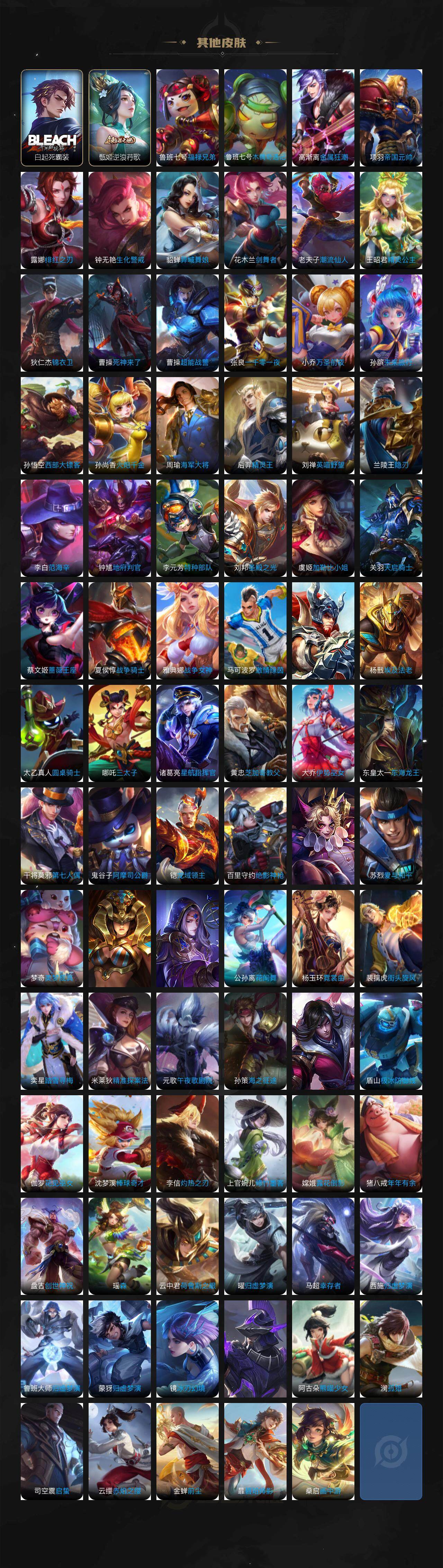 瑶遇见神鹿,娜可露露晚萤,伽罗箭羽风息,李元芳逐浪之夏,不知火舞魅语,公孙离无限星赏官,大乔猫狗日记,孙策猫狗日记,阿轲节奏热浪,露娜紫霞仙子,诸葛亮黄金分割率,王昭君偶像歌手,项羽苍穹之光,孙尚香时之恋人,阿轲暗夜猫娘,雅典娜冰冠公主,吕布末日机甲,橘右京修罗,嬴政摇滚巨星,刘禅绅士熊喵,刘禅天才门将,白起星夜王子,安琪拉心灵骇客,安琪拉时之奇旅,程咬金功夫厨神,刘邦德古拉伯爵,兰陵王暗隐猎兽者,曹操幽灵船长,宫本武藏鬼剑武藏,司马懿暗渊魔法,亚瑟心灵战警,钟馗乐园奇幻夜,蔡文姬舞动绿茵,廉颇地狱岩魂,西施诗语江南,小乔缤纷独角兽,夏侯惇乘风破浪,花木兰水晶猎龙者,铠曙光守护者,墨子金属风暴,百里玄策原初追逐者,吕布圣诞狂欢,貂蝉圣诞恋歌,百里守约特工魅影,嬴政暗夜贵公子,嫦娥拒霜思,雅典娜黎明之约,李白千年之狐,夏洛特永昼,弈星滕王阁序,杨玉环银翎春语,刘禅电玩·爆裂旋风,赵怀真鹤归松栖,莱西奥末日机甲,李元芳匿光侦查者,蒙犽百解令,周瑜雪夜绮愿,高渐离燃音魔法,大乔乘龙·忆丹青,安琪拉乘龙·聚宝船,苍狼魂孤将
