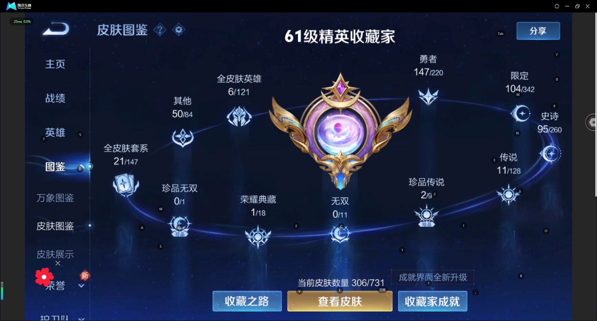 - PX_2110800-实名: 可修改 贵族等级: V8 英雄数: 125 皮肤数: 311 荣耀水晶: 九霄神辉 传说皮: 黄金狮子座,猫影幻舞,末日机甲-孙尚香,地狱之眼,时之恋人-刘备,超时空战士-狄仁杰,无双飞将,神器·狴犴令,山海·炽霜斩,山海·琳琅生,山海·苍雷引,燃星之曲,记忆之芯,妄想实况,妄想奇谈,鹤归松栖(云缨),乘龙·问璇玑,幻光神枪 限定皮: 遇见飞天,李小龙,飞衡,天狼狩猎
