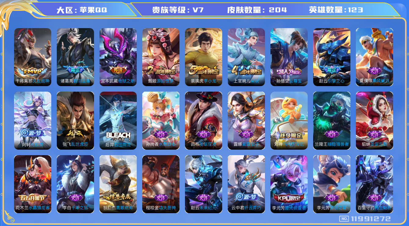 [11991272]V7 3传说 123英雄 204皮肤 可修改实名 优质装备:久胜战神,地狱之眼,鹤羽星尊 珍宝阁皮:蔷薇恋人 限定皮:至尊宝,游园惊梦,梁祝,李小龙,引擎之心 史诗皮:鸭鸭历险记-刘禅,化蝶舞,龙之律动,石田雨龙,紫霞仙子,特工魅影,千年之狐,匿光侦查者,偶像歌手,乱世虎臣,女仆咖啡,水果甜心,功夫厨神,暗隐猎兽者,纤云弄巧,乘风破浪,逐浪之夏,水晶猎龙者,金属风暴,圣诞狂欢,圣诞恋歌,鹰眼统帅,魅力维加斯,未来纪元-赵云