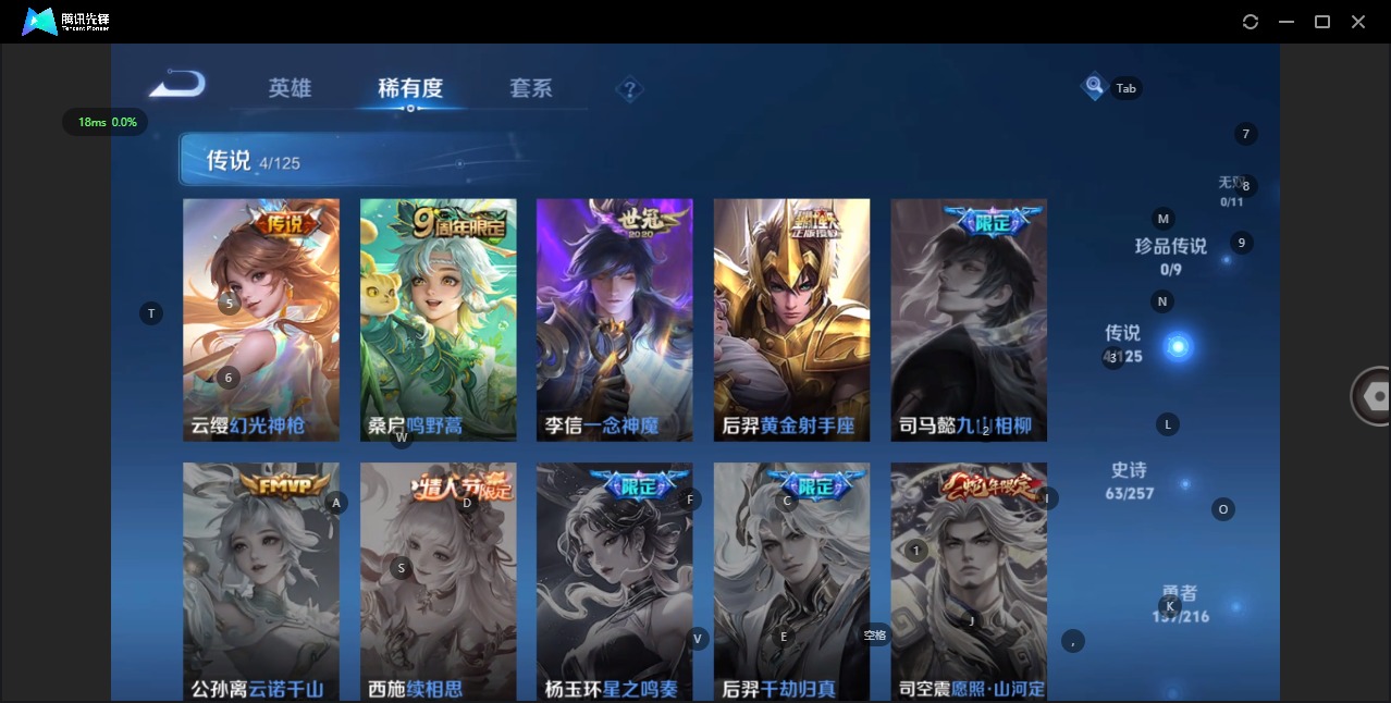 - [12146336]V7 1典藏 1珍品传说 11传说 124英雄 258皮肤 可修改实名 优质装备:鸣剑·曳影,怪盗基德,冠军飞将,炽阳神光,一念神魔,仲夏夜之梦(大飞蛾),地狱之眼,胖达荣荣,山海·炽霜斩(李信年限),霜月吟 传说皮:幻光神枪 珍宝阁皮:妄想食味,蔷薇恋人,女武神 限定皮:愿照·九州拓(澜年限),逐霄战戟,鸣野蒿,至尊宝,遇见飞天,高山流水,五谷丰年,游园惊梦,梁祝,李小龙 史诗皮:器灵·浮梦炉,化蝶舞,龙之律动,灵蛊蚀心,星界战将,茶境仙,百相守梦-百里守约,紫霞仙子,电玩小子(小书包),白龙吟,黄金分割率,千年之狐,冰冠公主,江河有灵,百解令(蒙犽),高渐离燃音魔法,蒙恬荣光圣徽,魅语,无限星赏官,偶像歌手,龙骑士(小龙虾),暗夜猫娘,末日机甲-吕布,猫狗日记-孙策,乱世虎臣,修罗,女仆咖啡,摇滚巨星,水果甜心,天才门将,星夜王子,暗隐猎兽者,幽灵船长,鬼剑武藏,纤云弄巧,拒霜思,缤纷独角兽,乘风破浪,逐浪之夏,月团寄思,水晶猎龙者,曙光守护者,箭羽风息,金属风暴,原初追逐者,圣诞狂欢,鹰眼统帅,暗夜贵公子,黎明之约,无心,未来纪元-赵云