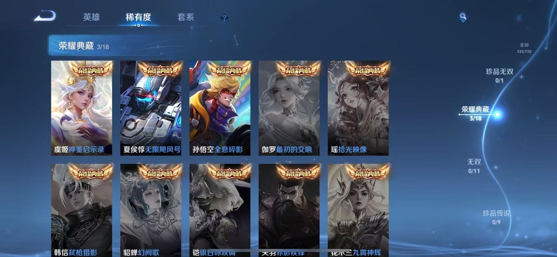 伽罗天狼溯光者,孙膑天狼运算者,干将莫邪冰霜恋舞曲,孙尚香异界灵契,牛魔奔雷神使,鲁班七号乒乒小将,项羽霸王别姬,吕布御风骁将,后羿辉光之辰,诸葛亮时雨天司,公孙离玉兔公主,公孙离蜜橘之夏,裴擒虎李小龙,裴擒虎天狼狩猎者,东皇太一逐梦之光,上官婉儿梁祝,花木兰默契交锋,马可波罗逐梦之星,马可波罗山海·玄木吟,马可波罗深海之息,桑启鸣野蒿,芈月白晶晶,孙悟空至尊宝,马超神威,百里守约朱雀志,虞姬霸王别姬,王昭君凤凰于飞,关羽冰锋战神