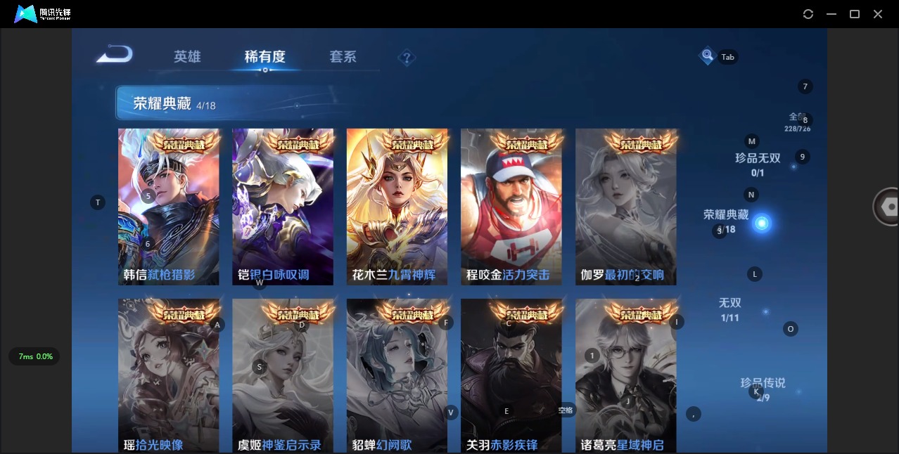 - [11347918]V7 1典藏 1珍品传说 11传说 124英雄 198皮肤 可修改实名 优质装备:神鉴启示录,器灵·落星盏,黄金狮子座,超时空战士-狄仁杰,浮生妄,百相守梦(张飞),霜月吟 珍宝阁皮:妄想食味 限定皮:愿照·岁时盈(虞姬年限),愿照·山河定(司空震年限),愿照·千秋盛(女娲年限),映山客,鸣野蒿,太华(伽罗年限),李小龙,寅虎·心曲(虎婆),神器·万象笔,山海·玄木吟(马可年限) 史诗皮:器灵·浮梦炉,化蝶舞,星界战将,龙之律动,石田雨龙,茶境仙,破空之剑,蒙犽顽岩魄,海诺心动手记,夜落电台,乘龙·聚宝船(安琪拉年限),百相守梦-黄忠,织梦人,遇见神鹿,特工魅影,真我赫兹(百里守约),闲日渔趣,蒙恬荣光圣徽,冰冠公主,偶像歌手,白蛇,电玩·兔顽号,电玩·爆裂旋风,银翎春语,龙骑士(小龙虾),末日机甲-吕布,猫狗日记-孙策,猫狗日记-大乔,乱世虎臣,摇滚巨星,水果甜心,时之奇旅-安琪拉,德古拉伯爵,幽灵船长,鬼剑武藏,心灵战警,乐园奇幻夜,舞动绿茵,乘风破浪,逐浪之夏,金属风暴,鹰眼统帅,魅力维加斯,滕王阁序,千筹问战