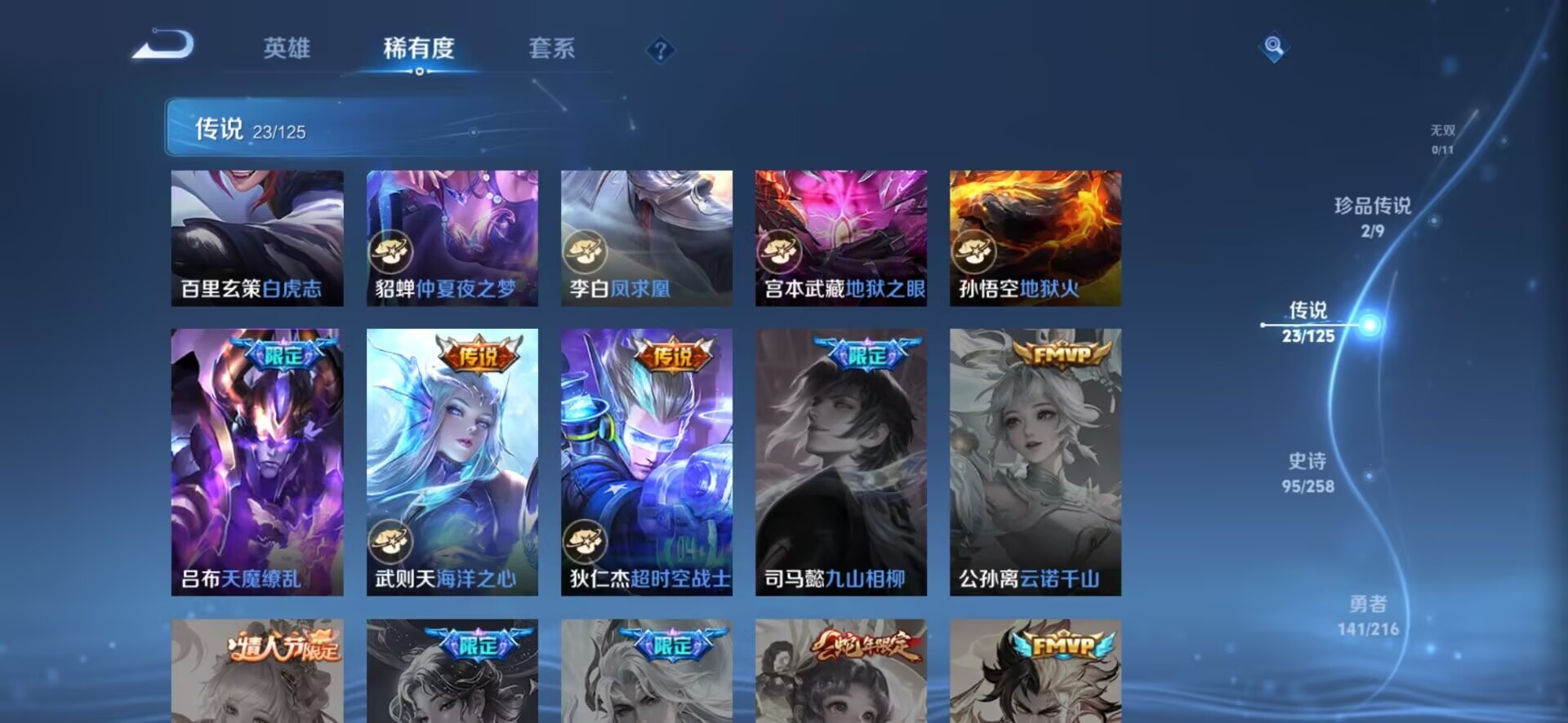 夏侯惇霜北刀,伽罗天狼溯光者,干将莫邪冰霜恋舞曲,典韦岱宗,后羿辉光之辰,司空震愿照·山河定,裴擒虎李小龙,裴擒虎天狼狩猎者,花木兰青春决赛季,安琪拉魔法小厨娘,马可波罗逐梦之星,艾琳陌上桑,西施至美·乘鲤谣,桑启鸣野蒿,猪八戒猪悟能,女娲愿照·千秋盛,孙悟空大圣娶亲,孙悟空至尊宝,百里玄策白虎志,雅典娜神奇女侠,妲己愿照·众生和,韩信飞衡,澜愿照·九州拓,虞姬愿照·岁时盈
