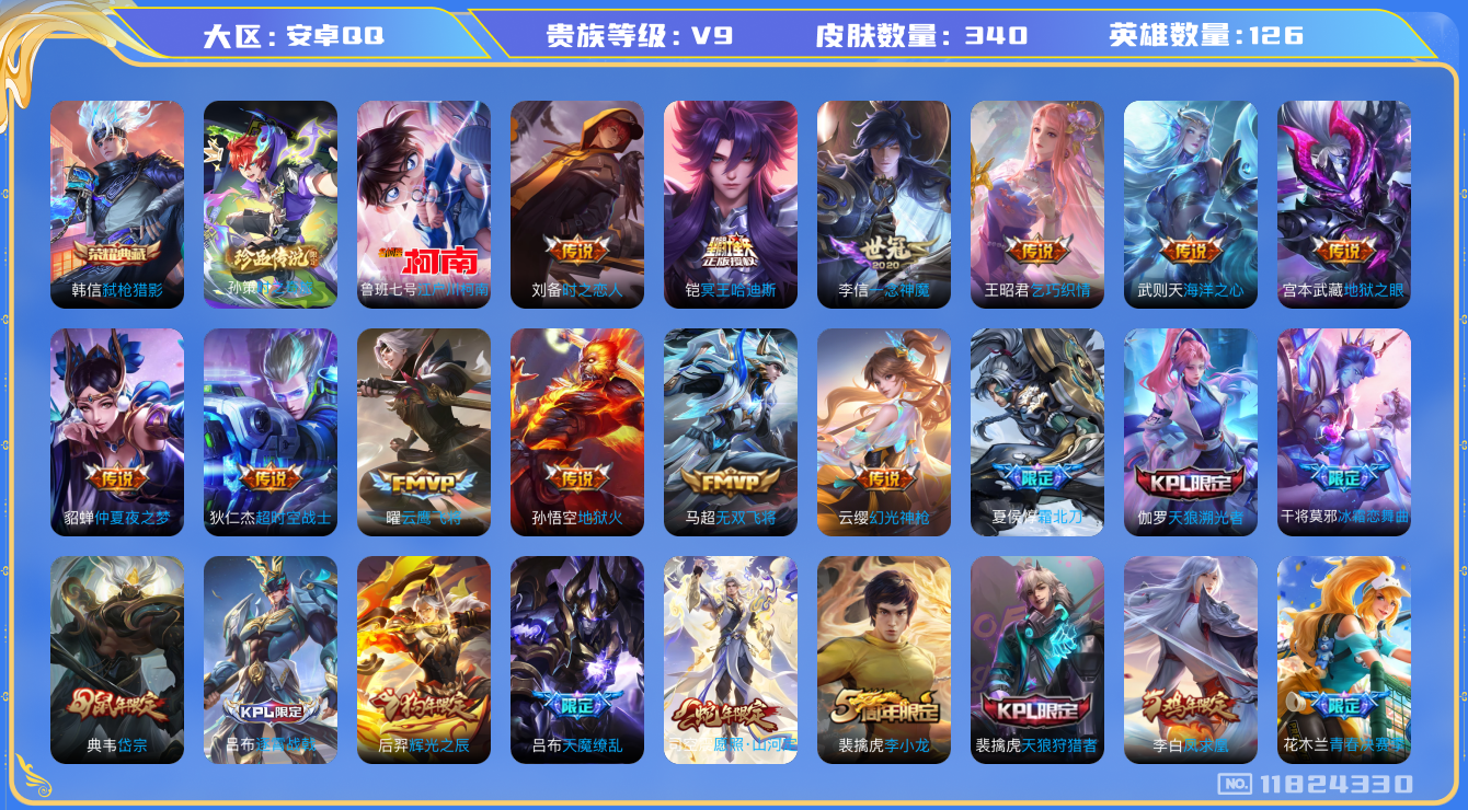 [11824330]V9 1典藏 2珍品传说 23传说 126英雄 340皮肤 典藏英雄武则天 可修改实名 优质装备:弑枪猎影(韩信典藏),江户川柯南,云鹰飞将(小将军),一念神魔,地狱火,仲夏夜之梦(大飞蛾),海洋之心,地狱之眼,乞巧织情,时之恋人-刘备(电焊工),超时空战士-狄仁杰,无双飞将 珍品传说:时之奇旅-孙策 传说皮:铠冥王哈迪斯,幻光神枪 珍宝阁皮:妄想食味 限定皮:愿照·九州拓(澜年限),愿照·岁时盈(虞姬年限),愿照·山河定(司空震年限),愿照·众生和(妲己年限),愿照·千秋盛(女娲年限),逐霄战戟,陌上桑,鸣野蒿,夏侯惇霜北刀,至尊宝,白虎志(电光耗子),凤求凰(白切鸡),魔法小厨娘,飞衡(韩信年限),至美·乘鲤谣,天狼狩猎者,逐梦之星,岱宗(典韦年限),天狼溯光者,李小龙,辉光之辰,猪悟能,大圣娶亲,天魔缭乱,青春决赛季,冰霜恋舞曲,神奇女侠 史诗皮:器灵·浮梦炉,化蝶舞,星界战将,龙之律动,石田雨龙,百相守梦-周瑜,戍鼓铭心,茶境仙,破空之剑,东方月初,蒙犽顽岩魄,埋骨钱,海诺心动手记,百相守梦-百里守约,百相守梦-黄忠,紫霞仙子,苍穹之光,黄金分割率,特工魅影,千年之狐,永昼,魅语,冰冠公主,青蛇,偶像歌手,晚萤,末日机甲-吕布,猫狗日记-孙策,猫狗日记-大乔,时之恋人-孙尚香,乱世虎臣,节奏热浪,修罗,女仆咖啡,摇滚巨星,水果甜心,绅士熊喵,天才门将,星夜王子,心灵骇客,功夫厨神,德古拉伯爵,暗隐猎兽者,幽灵船长,鬼剑武藏,暗渊魔法,心灵战警,乐园奇幻夜,天秀·启明,舞动绿茵,地狱岩魂,纤云弄巧,缤纷独角兽,乘风破浪,逐浪之夏,水晶猎龙者,曙光守护者,箭羽风息,金属风暴,圣诞狂欢,圣诞恋歌,鹰眼统帅,暗夜贵公子,魅力维加斯,赏金猎手,未来纪元-赵云