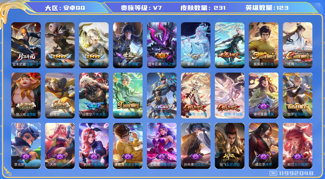 [11992048]【商品标题】:安卓Q-V7-永恒钻石IV段位-123英雄-231皮肤-0典藏-0珍品无双-0无双-1珍品传说-10传说-59史诗