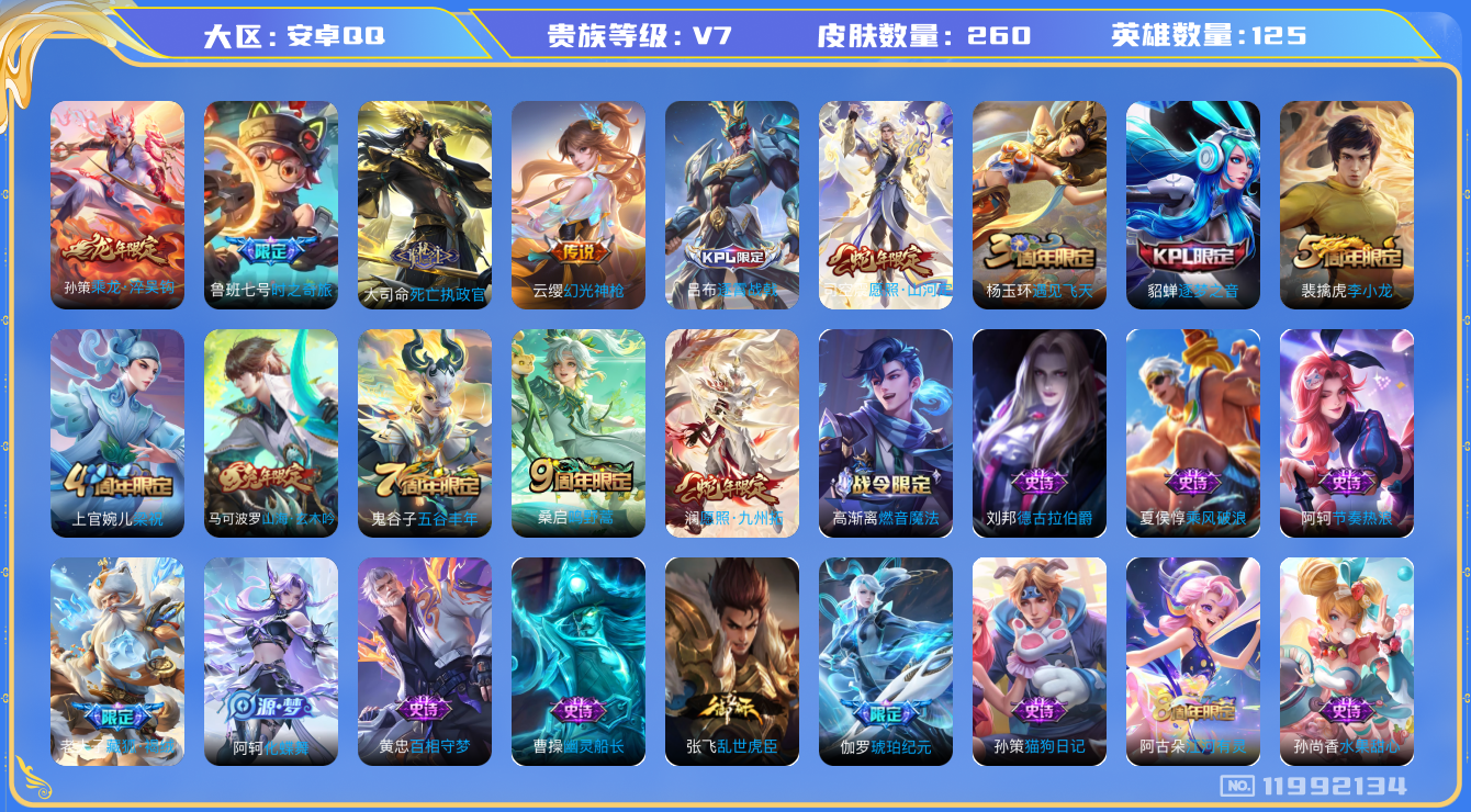 [11992134]V7 7传说 125英雄 260皮肤 可修改实名 优质装备:鲁班七号-时之奇旅 传说皮:乘龙·淬吴钩(孙策年限),死亡执政官,幻光神枪 珍宝阁皮:胡桃夹子,万物之道,蔷薇恋人 限定皮:愿照·九州拓(澜年限),愿照·山河定(司空震年限),逐霄战戟,鸣野蒿,遇见飞天,五谷丰年,梁祝,逐梦之音,李小龙,山海·玄木吟(马可年限) 史诗皮:糖绘人间,化蝶舞,星界战将,龙之律动,藏狐·褐绒,蒙犽顽岩魄,琥珀纪元伽罗,蔬乡物语(鲁班七号),百相守梦-黄忠,黄金分割率,特工魅影,千年之狐,江河有灵,匿光侦查者,鹤归松栖(赵怀真),真我赫兹(镜),魅语,百解令(蒙犽),高渐离燃音魔法,蒙恬荣光圣徽,无限星赏官,冰冠公主,晚萤,电玩·爆裂旋风,银翎春语,猫狗日记-孙策,乱世虎臣,节奏热浪,女仆咖啡,水果甜心,星夜王子,功夫厨神,德古拉伯爵,暗隐猎兽者,幽灵船长,鬼剑武藏,心灵战警,舞动绿茵,纤云弄巧,繁星吟游(呼啦呼啦),拒霜思,乘风破浪,逐浪之夏,水晶猎龙者,金属风暴,圣诞狂欢,圣诞恋歌,鹰眼统帅,暗夜贵公子,黎明之约,无心,未来纪元-赵云