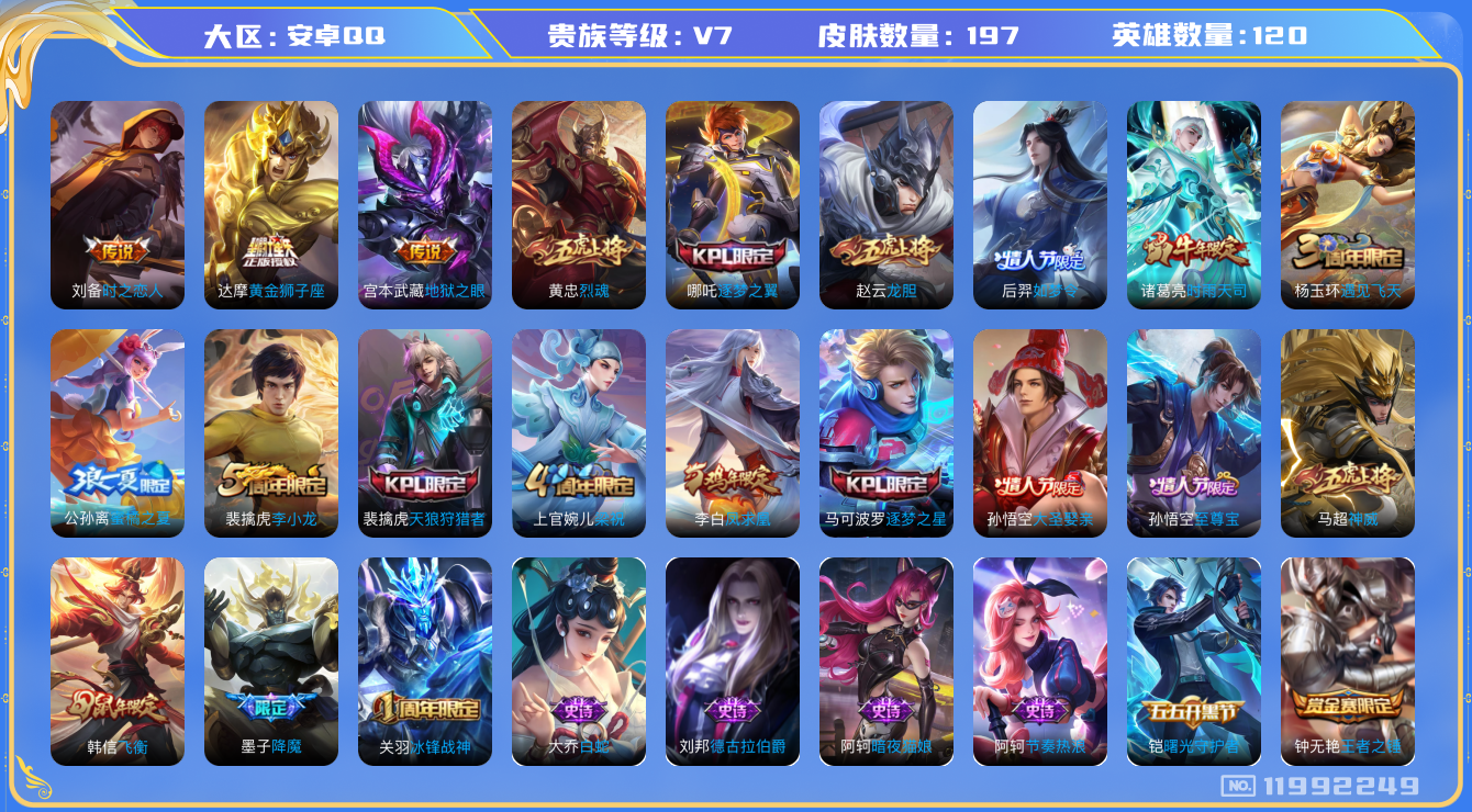 [11992249]V7 5传说 120英雄 197皮肤 可修改实名 优质装备:黄金狮子座,地狱之眼,时之恋人-刘备(电焊工) 珍宝阁皮:妄想食味 限定皮:至尊宝,凤求凰(白切鸡),时雨天司(水龙头),神威(电光马子),飞衡(韩信年限),遇见飞天,降魔,冰锋战神,梁祝,天狼狩猎者,龙胆,逐梦之翼,逐梦之星,烈魂,李小龙,如梦令-后羿,大圣娶亲,蜜橘之夏 史诗皮:苍穹之光,黄金分割率,千年之狐,冰冠公主,白蛇,暗夜猫娘,时之恋人-孙尚香,乱世虎臣,节奏热浪,摇滚巨星,水果甜心,心灵骇客,德古拉伯爵,暗隐猎兽者,幽灵船长,心灵战警,繁星吟游(呼啦呼啦),缤纷独角兽,曙光守护者,金属风暴,原初追逐者,圣诞狂欢,鹰眼统帅,王者之锤,魅力维加斯,无心,未来纪元-赵云