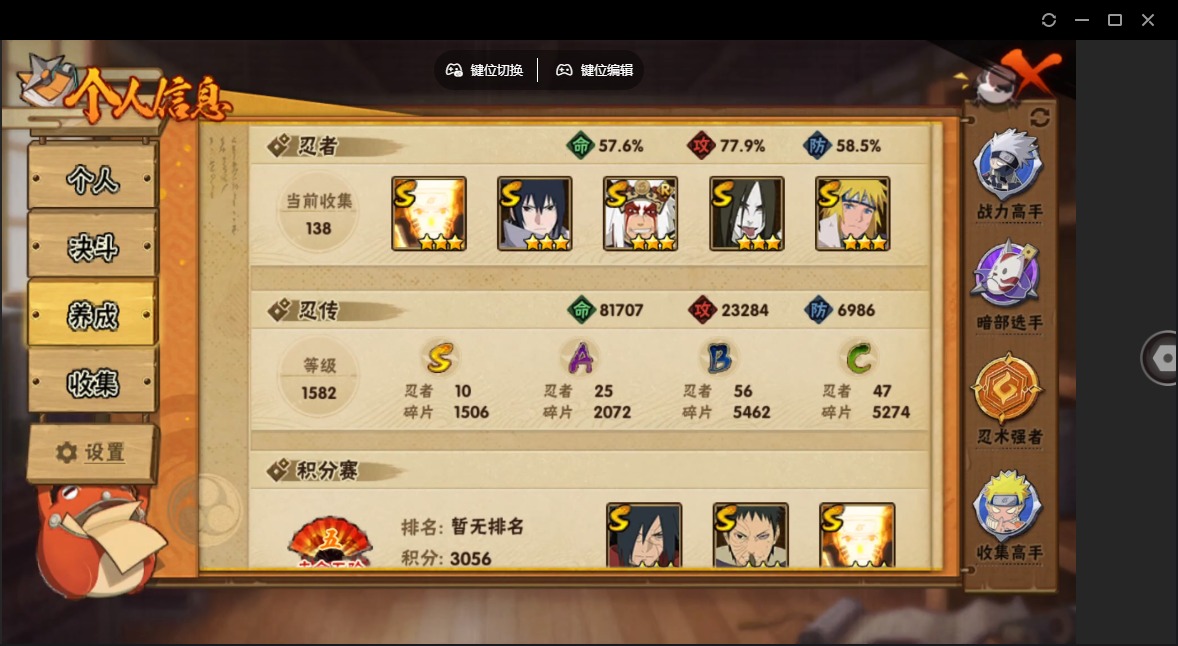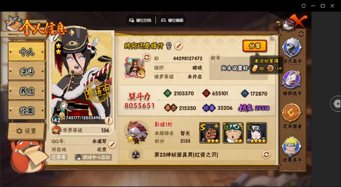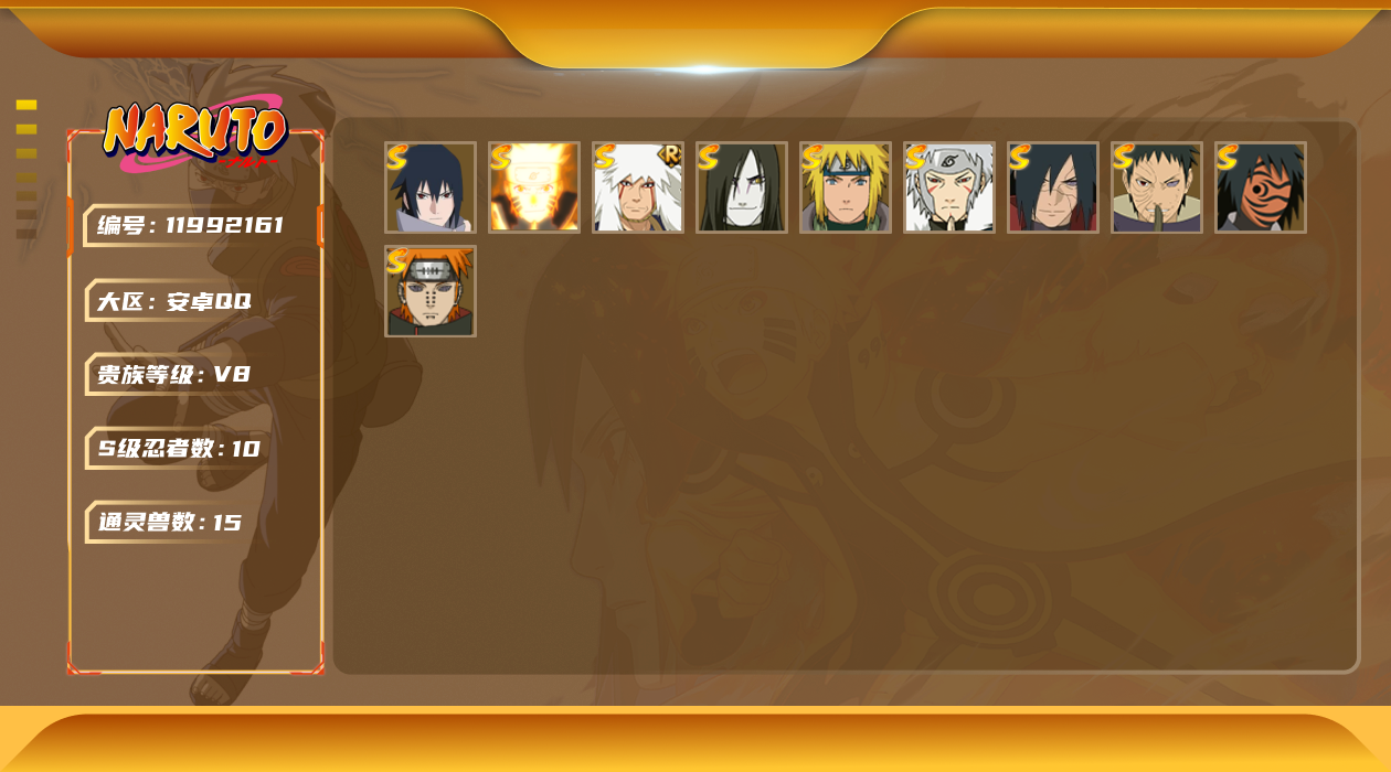 [11992161]V8 10S忍 25A忍 15通灵 805.5W战力 可二次 可修改实名 优质装备:千手扉间,宇智波带土 「忍界大战」,漩涡鸣人 「九喇嘛连结」,神秘面具男 「红夜之刃」,宇智波佐助「永恒万花筒」,宇智波斑「秽土转生·解」 S级忍者:自来也 「舞之豪杰」,佩恩「天道」,波风水门,大蛇丸