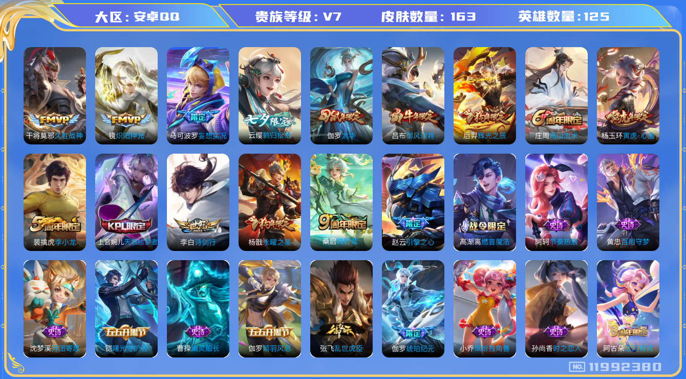 [11992380]V7 8传说 125英雄 163皮肤 可修改实名 优质装备:久胜战神,炽阳神光,妄想实况,鹤归松栖(云缨) 珍宝阁皮:妄想食味,蔷薇恋人 限定皮:鸣野蒿,太华(伽罗年限),高山流水,诗剑行,御风骁将(吕布年限),天狼绘梦者,李小龙,永曜之星,辉光之辰,引擎之心,寅虎·心曲(虎婆) 史诗皮:琥珀纪元伽罗,百相守梦-黄忠,黄金分割率,特工魅影,江河有灵,鹤归松栖(赵怀真),百解令(蒙犽),高渐离燃音魔法,偶像歌手,电玩·爆裂旋风,末日机甲-吕布,时之恋人-孙尚香,乱世虎臣,节奏热浪,修罗,天才门将,暗隐猎兽者,幽灵船长,鬼剑武藏,纤云弄巧,繁星吟游(呼啦呼啦),拒霜思,缤纷独角兽,逐浪之夏,月团寄思,曙光守护者,热力回旋,箭羽风息,金属风暴,圣诞狂欢,圣诞恋歌,鹰眼统帅,暗夜贵公子,魅力维加斯,未来纪元-赵云