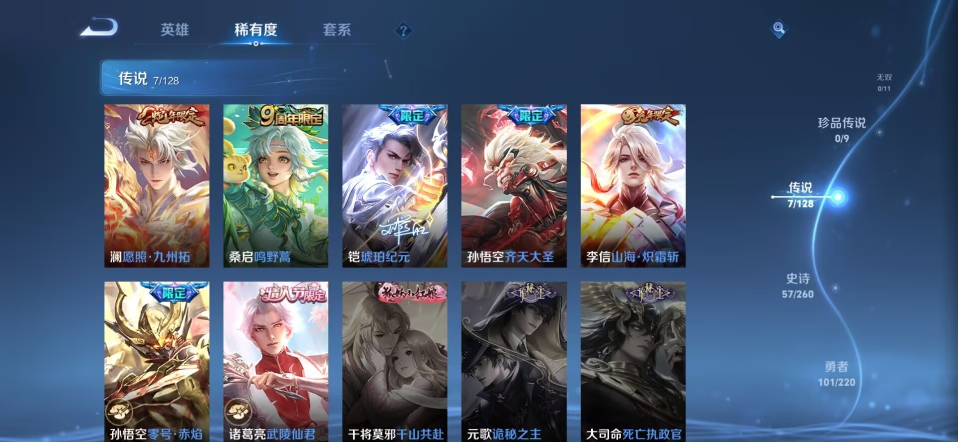 - [11622765]V10 8典藏 4无双 1珍品传说 60传说 126英雄 504皮肤 典藏英雄武则天 可修改实名 优质装备:倪克斯神谕(宇宙婆娘),杀手不太冷,鸣剑·曳影,全息碎影(猴子典藏),星域神启(倪克斯贼亮),幻阙歌(貂蝉典藏),弑枪猎影(韩信典藏),真我赫兹(瑶)(瑶无双),青丘·九尾(妲己无双),碎月剑心(李白无双),神鉴启示录,器灵·螭龙剑,器灵·落星盏,黄金狮子座,黄金射手座,冠军飞将,云鹰飞将(小将军),绛天战甲(鸡嘴战神),猫影幻舞,久胜战神,炽阳神光,一念神魔,云霓雀翎,地狱火,仲夏夜之梦(大飞蛾),音你心动-小乔,海洋之心,地狱之眼,飞鸢探春,音你心动-周瑜,胖达荣荣,李逍遥,乞巧织情,时之恋人-刘备(电焊工),淬星耀世,超时空战士-狄仁杰,挚爱之约,山海·炽霜斩(李信年限),山海·琳琅生(小乔年限),山海·苍雷引(电光曜子),浮生妄,青丘·九尾,鹤羽星尊,鹤归松栖(云缨),艾琳觅芳踪,千劫归真,涂山容容 传说皮:乘龙·问璇玑(孙尚香年限),乘龙·铭钟鼎(赵云年限),乘龙·淬吴钩(孙策年限),落雪白狼,星之鸣奏,幻光神枪 珍宝阁皮:妄想食味,万物之道,优雅恋人,蔷薇恋人,女武神 限定皮:愿照·九州拓(澜年限),愿照·福禄聚(蔡文姬年限),愿照·岁时盈(虞姬年限),愿照·山河定(司空震年限),愿照·众生和(妲己年限),愿照·千秋盛(女娲年限),鸣野蒿,至尊宝,白虎志(电光耗子),凤求凰(白切鸡),凤凰于飞,梅西,傲雪梅枪,补天,寅虎·展翼(孙膑年限),绯月行,白晶晶,时雨天司(水龙头),神威(电光马子),飞衡(韩信年限),山海·碧波行(瑶年限),无限倾心-项羽,影龙天霄,遇见飞天,高山流水,诗剑行,无限倾心-虞姬,齐天大圣,降魔,五谷丰年,青龙志(铠年限),冰锋战神,幽恒(沐浴露),游园惊梦,梁祝,御风骁将(吕布年限),天狼狩猎者,龙胆,逐梦之翼,烈魂,天狼溯光者,祈雪灵祝(雪兔子),李小龙,逐梦之影,玄武志(苏烈年限),朱雀志(守约年限),辉光之辰,圣诞老人,真爱至上,纯白花嫁,孙行者,猪悟能,一生所爱,引擎之心,青春决赛季,冰霜恋舞曲,蜜橘之夏,美猴王,匿光追影者,女儿国国王,寅虎·御盾(廉颇年限),寅虎·心曲(虎婆),寅虎·赤拳(老虎年限),时之祈愿-云中君,时之祈愿-瑶(瑶传限),百木心枪,玉兔公主,启示之音,唐三藏,神器·万象笔,梦圆繁星,山海