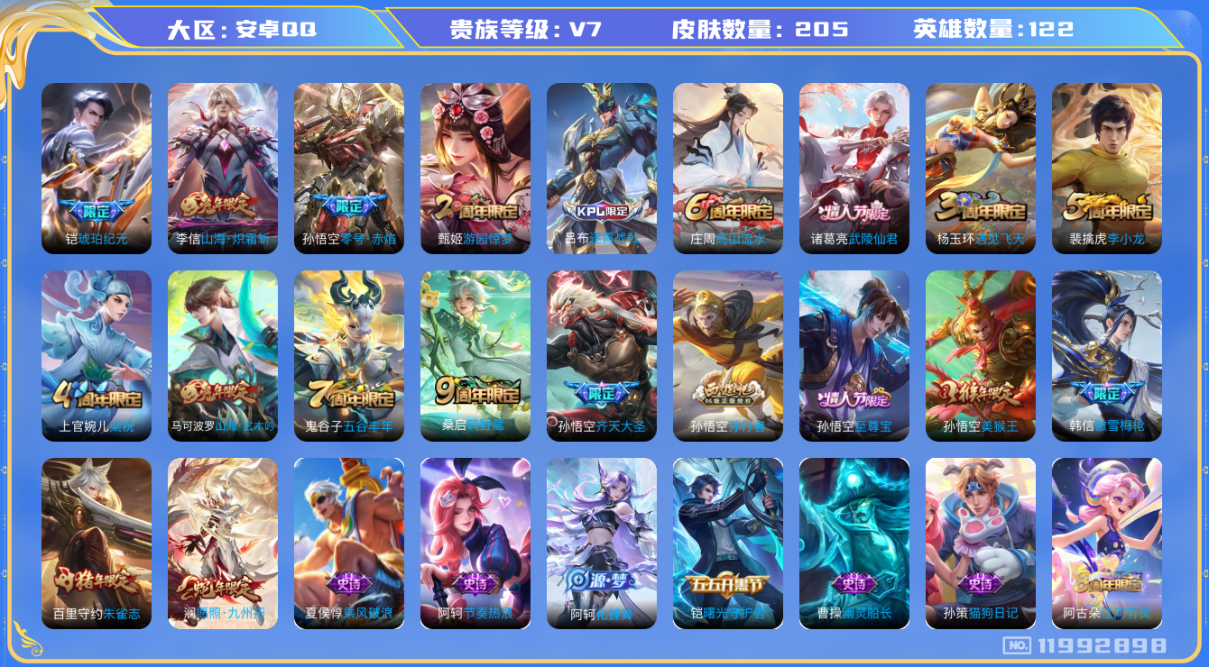 [11992898]V7 7传说 122英雄 205皮肤 可修改实名 优质装备:零号·赤焰,山海·炽霜斩(李信年限),琥珀纪元铠 珍宝阁皮:妄想食味,胡桃夹子,蔷薇恋人 限定皮:愿照·九州拓(澜年限),逐霄战戟,鸣野蒿,至尊宝,武陵仙君(小桃花),傲雪梅枪,遇见飞天,高山流水,齐天大圣,五谷丰年,游园惊梦,梁祝,李小龙,朱雀志(守约年限),孙行者,美猴王,山海·玄木吟(马可年限) 史诗皮:化蝶舞,破空之剑,黄金分割率,千年之狐,永昼,江河有灵,魅语,百解令(蒙犽),偶像歌手,晚萤,末日机甲-吕布,猫狗日记-孙策,节奏热浪,摇滚巨星,水果甜心,绅士熊喵,天才门将,星夜王子,心灵骇客,暗隐猎兽者,幽灵船长,鬼剑武藏,心灵战警,舞动绿茵,纤云弄巧,繁星吟游(呼啦呼啦),拒霜思,乘风破浪,逐浪之夏,水晶猎龙者,曙光守护者,金属风暴,圣诞狂欢,圣诞恋歌,鹰眼统帅,魅力维加斯,黎明之约,无心,未来纪元-赵云
