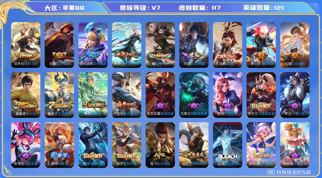 [11993258]V7 10传说 121英雄 117皮肤 可修改实名 优质装备:冠军飞将,云鹰飞将(小将军),一念神魔,时之恋人-刘备(电焊工),电玩·雷克斯,妄想实况 传说皮:乘龙·铭钟鼎(赵云年限),吕布曦玄引,幻光神枪 珍宝阁皮:妄想食味 限定皮:鸣野蒿,五谷丰年,御风骁将(吕布年限),李小龙 史诗皮:石田雨龙,东方月初,白龙吟,黄金分割率,特工魅影,千年之狐,江河有灵,百解令(蒙犽),偶像歌手,电玩·爆裂旋风,末日机甲-吕布,乱世虎臣,节奏热浪,女仆咖啡,水果甜心,绅士熊喵,心灵骇客,暗隐猎兽者,鬼剑武藏,水晶猎龙者,曙光守护者,箭羽风息,金属风暴,圣诞狂欢,鹰眼统帅,未来纪元-赵云