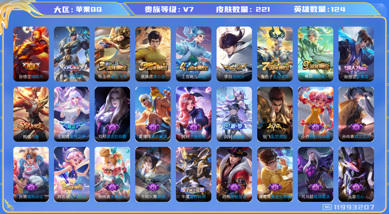 [11993207]V7 4传说 124英雄 221皮肤 可修改实名 优质装备:地狱火,涂山容容 珍宝阁皮:胡桃夹子,玩趣恶龙 限定皮:逐霄战戟,鸣野蒿,至尊宝,星穹之声,飞衡(韩信年限),遇见飞天,诗剑行,五谷丰年,梁祝,李小龙 史诗皮:化蝶舞,星界战将,黄金分割率,特工魅影,江河有灵,魅语,百解令(蒙犽),蒙恬荣光圣徽,冰冠公主,猫狗日记-孙策,时之恋人-孙尚香,乱世虎臣,节奏热浪,水果甜心,星夜王子,心灵骇客,功夫厨神,德古拉伯爵,鬼剑武藏,暗渊魔法,舞动绿茵,纤云弄巧,繁星吟游(呼啦呼啦),缤纷独角兽,乘风破浪,逐浪之夏,水晶猎龙者,金属风暴,原初追逐者,圣诞狂欢,圣诞恋歌,鹰眼统帅,魅力维加斯,黎明之约,无心,未来纪元-赵云