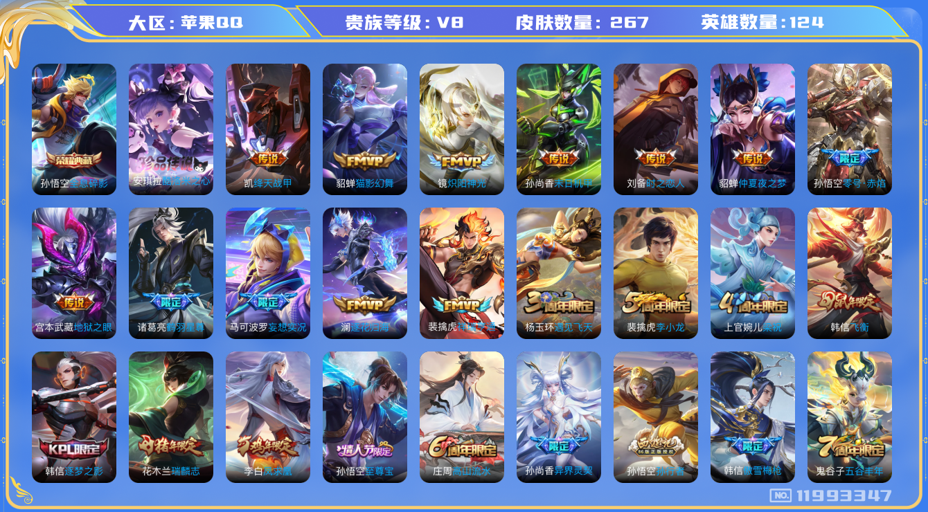 [11993347]【商品标题】:苹果Q-V8-至尊星耀V段位-124英雄-267皮肤-1典藏-0珍品无双-0无双-1珍品传说-15传说-63史诗