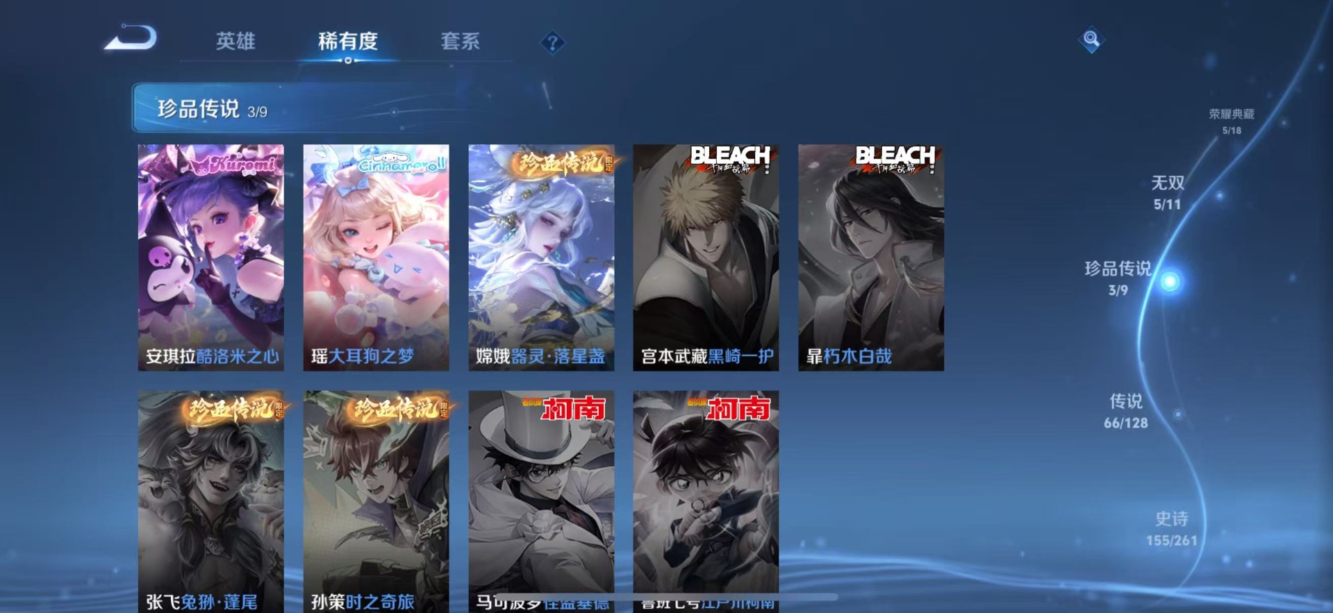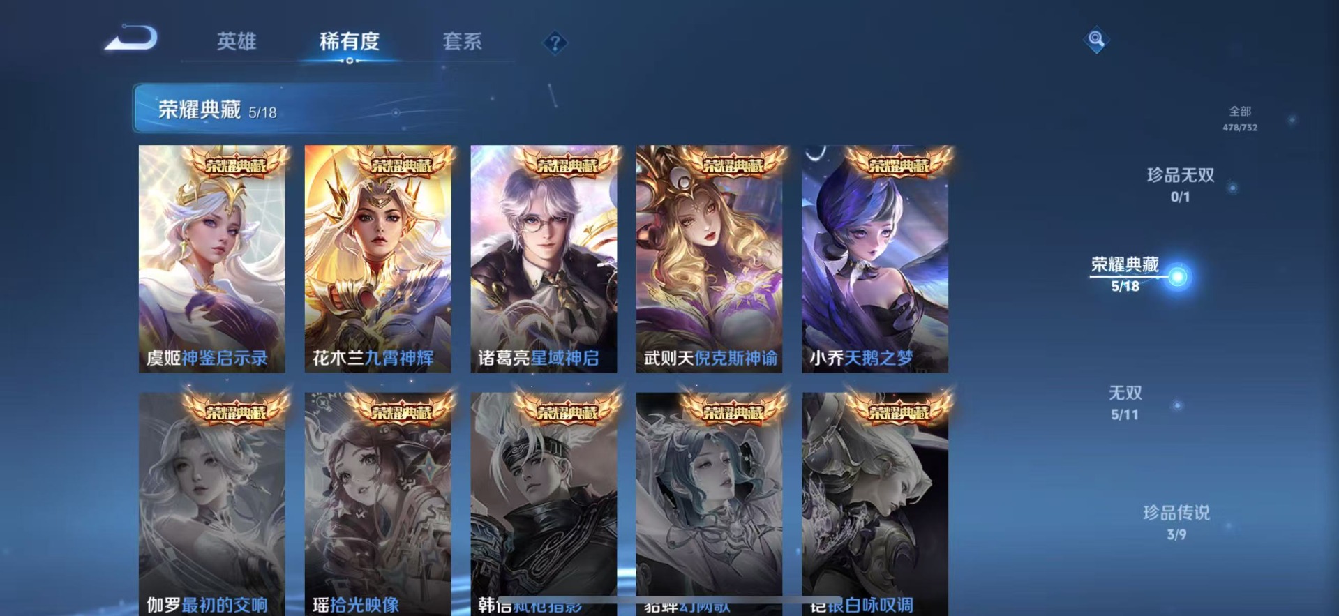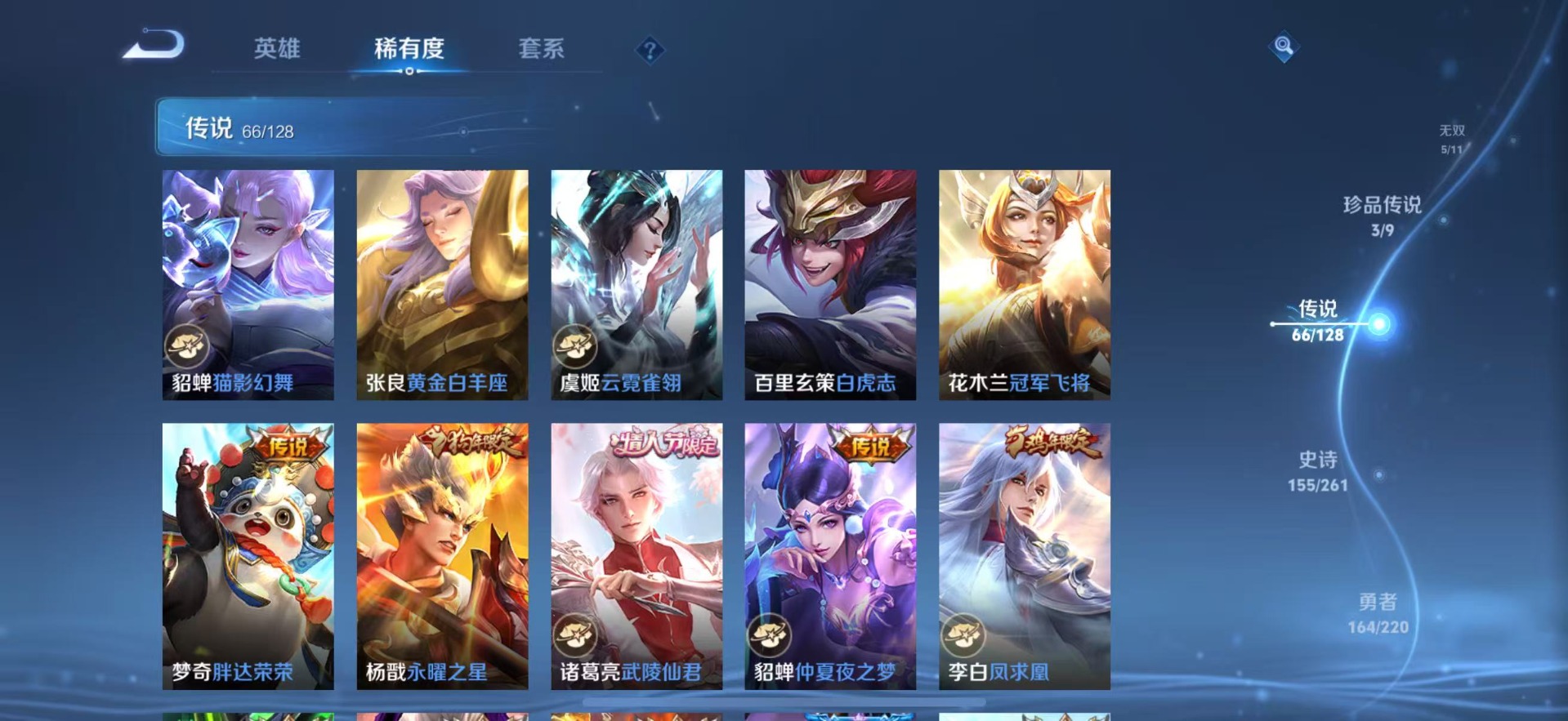 大乔白鹤梁神女,金蝉唐三藏,哪吒逐梦之翼,甄姬幽恒,甄姬至美·化雀舞,铠青龙志,廉颇寅虎·御盾,伽罗天狼溯光者,孙膑寅虎·展翼,干将莫邪冰霜恋舞曲,项羽霸王别姬,鲁班七号寅虎·瑞焰,后羿辉光之辰,庄周云端筑梦师,诸葛亮时雨天司,公孙离祈雪灵祝,杨玉环寅虎·心曲,兰陵王影龙天霄,公孙离蜜橘之夏,裴擒虎梅西,貂蝉逐梦之音,鲁班大师匿光启智者,裴擒虎李小龙,裴擒虎天狼狩猎者,裴擒虎寅虎·赤拳,东皇太一逐梦之光,上官婉儿梁祝,上官婉儿神器·万象笔,花木兰默契交锋,花木兰青春决赛季,马可波罗山海·玄木吟,西施至美·乘鲤谣,桑启鸣野蒿,猪八戒猪悟能,孙悟空孙行者,孙悟空大圣娶亲,孙悟空至尊宝,孙悟空美猴王,百里玄策白虎志,马超神威,雅典娜神奇女侠,云中君时之祈愿,妲己时之奇旅,妲己愿照·众生和,韩信飞衡,韩信逐梦之影,百里守约朱雀志,蔡文姬奇迹圣诞,蔡文姬愿照·福禄聚,瑶时之祈愿,瑶山海·碧波行,澜愿照·九州拓,虞姬霸王别姬,虞姬愿照·岁时盈,娜可露露前尘镜,妲己热情桑巴,王昭君凤凰于飞,王昭君星穹之声,关羽冰锋战神