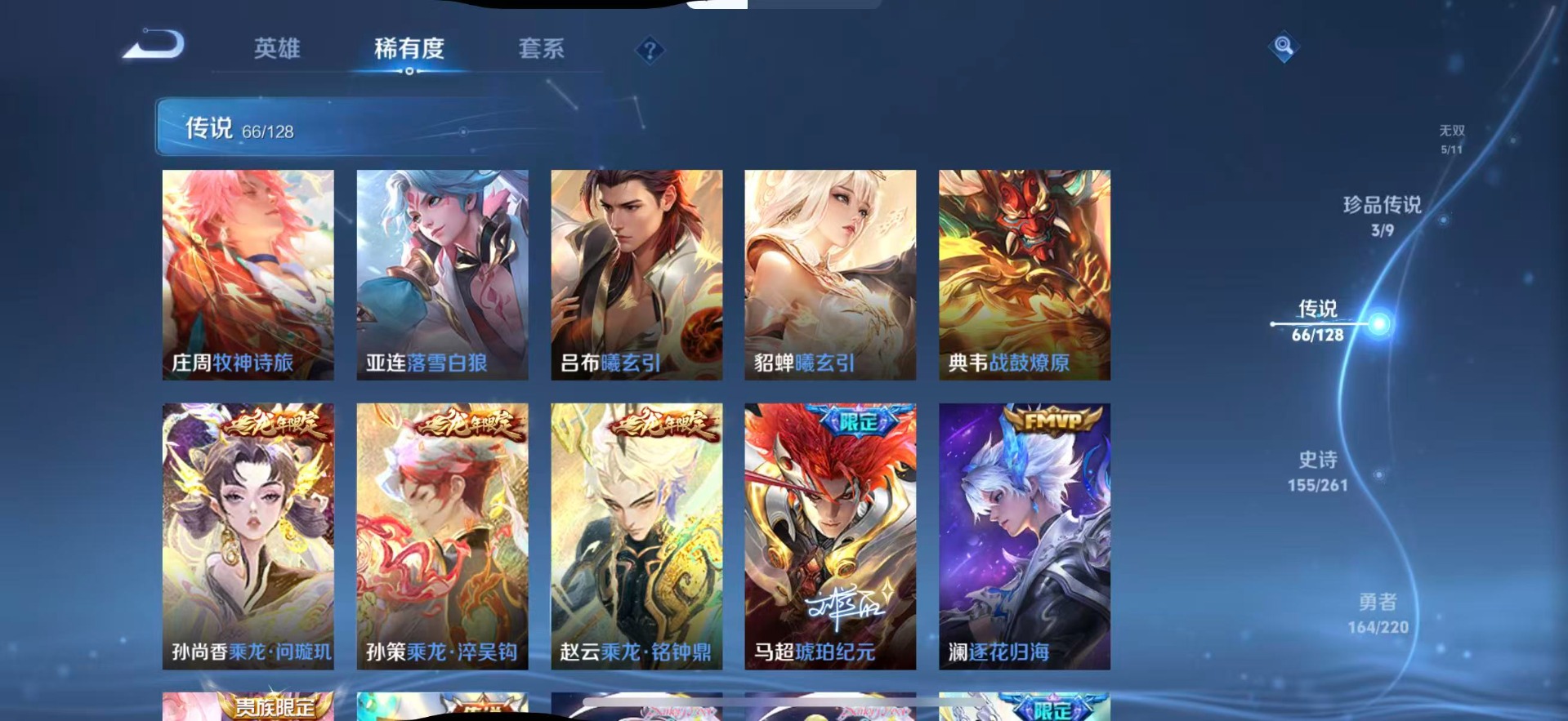 [11994059]无双贵族 5典藏 5无双 3珍品传说 66传说 126英雄 478皮肤 典藏英雄武则天 庄周小国标 张良小国标 可修改实名 优质装备:天鹅之梦(小乔典藏),倪克斯神谕(宇宙婆娘),星域神启(倪克斯贼亮),九霄神辉(木兰典藏),真我赫兹(瑶)(瑶无双),碎月剑心(李白无双),神鉴启示录,小乔时之魔女(小乔无双),器灵·螭龙剑,天机白泽,器灵·落星盏,酷洛米之心,大耳狗之梦,冠军飞将,绛天战甲(鸡嘴战神),黄金白羊座,猫影幻舞,炽阳神光,一念神魔,云霓雀翎,末日机甲-孙尚香(绿蚂蚱),地狱火,仲夏夜之梦(大飞蛾),音你心动-小乔,海洋之心,地狱之眼,飞鸢探春,音你心动-周瑜,胖达荣荣,李逍遥,乞巧织情,时之恋人-刘备(电焊工),游龙清影(小青龙),超时空战士-狄仁杰,遇见胡旋,燃星之曲,鹤羽星尊,妄想实况,遇见神鼓,大乔-时之奇旅,永恒水手月亮,夜礼服假面,小动物乐团,澜逐花归海,艾琳觅芳踪,琥珀纪元马超,牧神诗旅,诡秘之主 传说皮:乘龙·问璇玑(孙尚香年限),乘龙·铭钟鼎(赵云年限),乘龙·淬吴钩(孙策年限),貂蝉曦玄引,吕布曦玄引,典韦战鼓燎原,落雪白狼,死亡执政官,九山相柳,星之鸣奏,幻光神枪 珍宝阁皮:万物之道,优雅恋人,蔷薇恋人 限定皮:愿照·九州拓(澜年限),愿照·福禄聚(蔡文姬年限),愿照·岁时盈(虞姬年限),愿照·众生和(妲己年限),鸣野蒿,至尊宝,白虎志(电光耗子),凤求凰(白切鸡),凤凰于飞,梅西,武陵仙君(小桃花),寅虎·展翼(孙膑年限),前尘镜,星穹之声,白鹤梁神女,时雨天司(水龙头),神威(电光马子),飞衡(韩信年限),山海·碧波行(瑶年限),至美·乘鲤谣,至美·化雀舞,影龙天霄,遇见飞天,高山流水,五谷丰年,青龙志(铠年限),冰锋战神,幽恒(沐浴露),游园惊梦,梁祝,天狼狩猎者,逐梦之翼,天狼溯光者,逐梦之音,祈雪灵祝(雪兔子),李小龙,逐梦之影,逐梦之光,朱雀志(守约年限),永曜之星,辉光之辰,霸王别姬-项羽,霸王别姬-虞姬,奇迹圣诞,默契交锋-花木兰,孙行者,猪悟能,大圣娶亲,天魔缭乱,青春决赛季,冰霜恋舞曲,云端筑梦师,蜜橘之夏,热情桑巴,神奇女侠,美猴王,寅虎·御盾(廉颇年限),寅虎·瑞焰(虎皮蛋子),寅虎·心曲(虎婆),寅虎·赤拳(老虎年限),时之祈愿-云中君,时之祈愿-瑶(瑶传限),唐三藏,匿光启智者