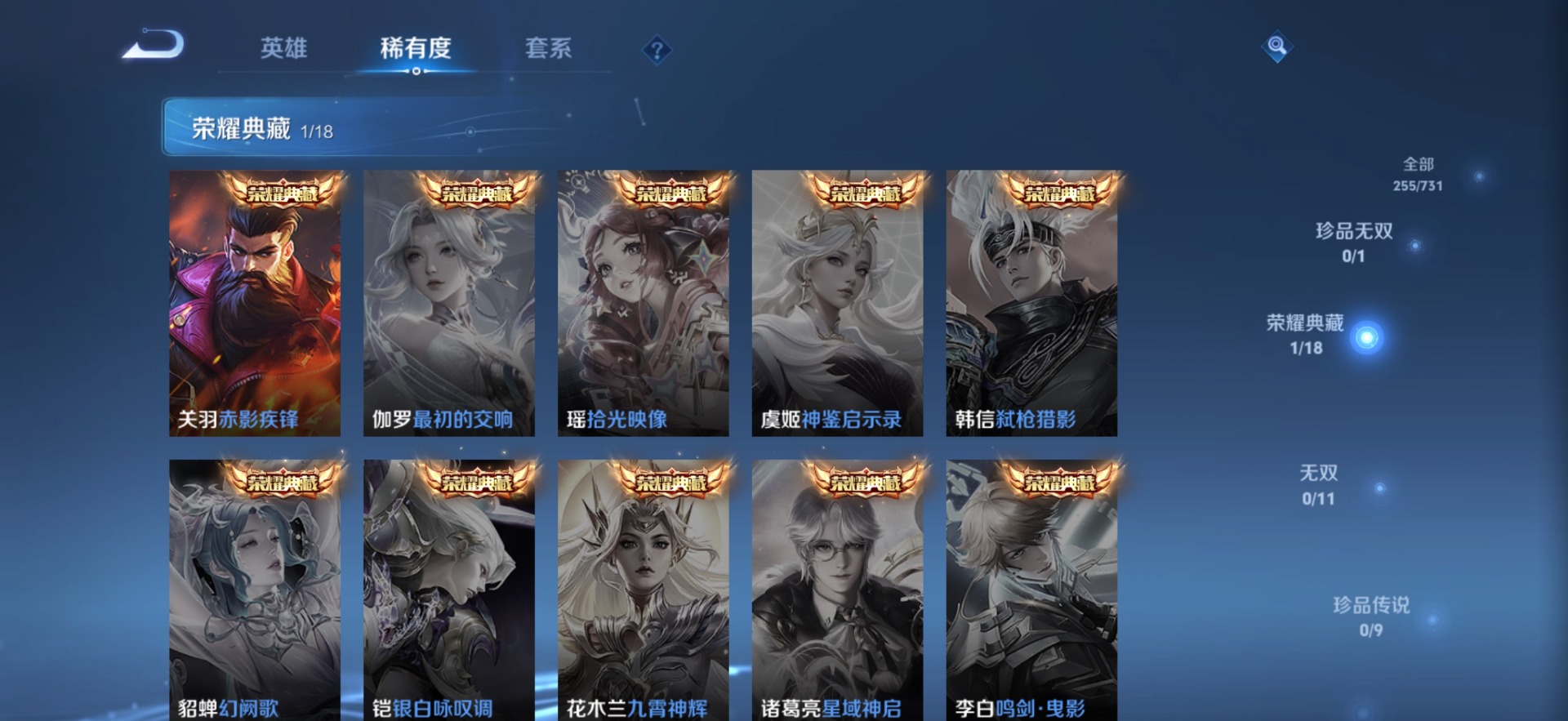 刘邦德古拉伯爵,夏侯惇乘风破浪,阿轲暗夜猫娘,阿轲节奏热浪,铠曙光守护者,曹操幽灵船长,廉颇地狱岩魂,伽罗箭羽风息,小乔缤纷独角兽,孙策猫狗日记,赵怀真器灵·浮梦炉,鲁班七号电玩小子,项羽苍穹之光,吕布圣诞狂欢,吕布末日机甲,露娜紫霞仙子,诸葛亮黄金分割率,刘禅电玩·爆裂旋风,刘禅天才门将,宫本武藏鬼剑武藏,公孙离无限星赏官,兰陵王暗隐猎兽者,貂蝉圣诞恋歌,李白谪仙醉月,花木兰水晶猎龙者,李白千年之狐,安琪拉心灵骇客,白起星夜王子,白起苍鳞隐世,亚瑟心灵战警,嬴政摇滚巨星,嬴政暗夜贵公子,程咬金功夫厨神,百里玄策原初追逐者,雅典娜黎明之约,李元芳逐浪之夏,墨子金属风暴,蔡文姬舞动绿茵,瑶遇见神鹿,王昭君偶像歌手,嫦娥拒霜思,钟馗乐园奇幻夜