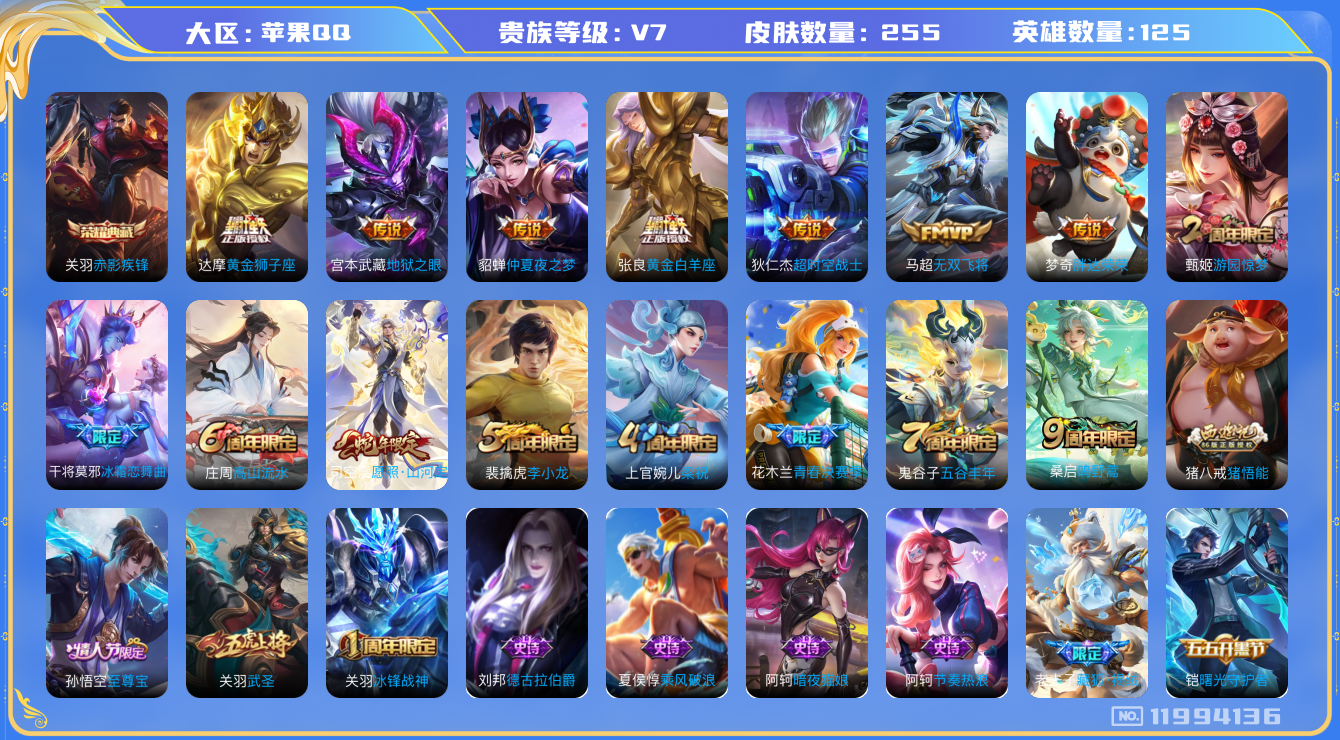 [11994136]V7 1典藏 10传说 125英雄 255皮肤 可修改实名 优质装备:赤影疾锋,黄金狮子座,黄金白羊座,仲夏夜之梦(大飞蛾),地狱之眼,胖达荣荣,超时空战士-狄仁杰,无双飞将 珍宝阁皮:妄想食味,优雅恋人,蔷薇恋人 限定皮:愿照·山河定(司空震年限),鸣野蒿,至尊宝,高山流水,五谷丰年,冰锋战神,武圣,游园惊梦,梁祝,李小龙,猪悟能,青春决赛季,冰霜恋舞曲 史诗皮:苍鳞隐世,器灵·浮梦炉,星界战将,谪仙醉月,龙之律动,藏狐·褐绒,石田雨龙,茶境仙,百相守梦-百里守约,遇见神鹿,紫霞仙子,苍穹之光,电玩小子(小书包),黄金分割率,千年之狐,江河有灵,蒙恬荣光圣徽,无限星赏官,偶像歌手,电玩·爆裂旋风,暗夜猫娘,末日机甲-吕布,猫狗日记-孙策,乱世虎臣,节奏热浪,女仆咖啡,摇滚巨星,水果甜心,天才门将,星夜王子,心灵骇客,功夫厨神,德古拉伯爵,暗隐猎兽者,幽灵船长,鬼剑武藏,心灵战警,乐园奇幻夜,舞动绿茵,地狱岩魂,繁星吟游(呼啦呼啦),拒霜思,缤纷独角兽,乘风破浪,逐浪之夏,水晶猎龙者,曙光守护者,箭羽风息,金属风暴,原初追逐者,圣诞狂欢,圣诞恋歌,鹰眼统帅,暗夜贵公子,魅力维加斯,黎明之约,无心,未来纪元-赵云